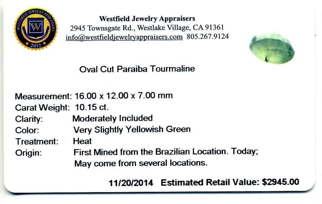 10.15ctw. Oval Cut Paraiba Tourmaline. Westfield Appraised at $2,945.00.