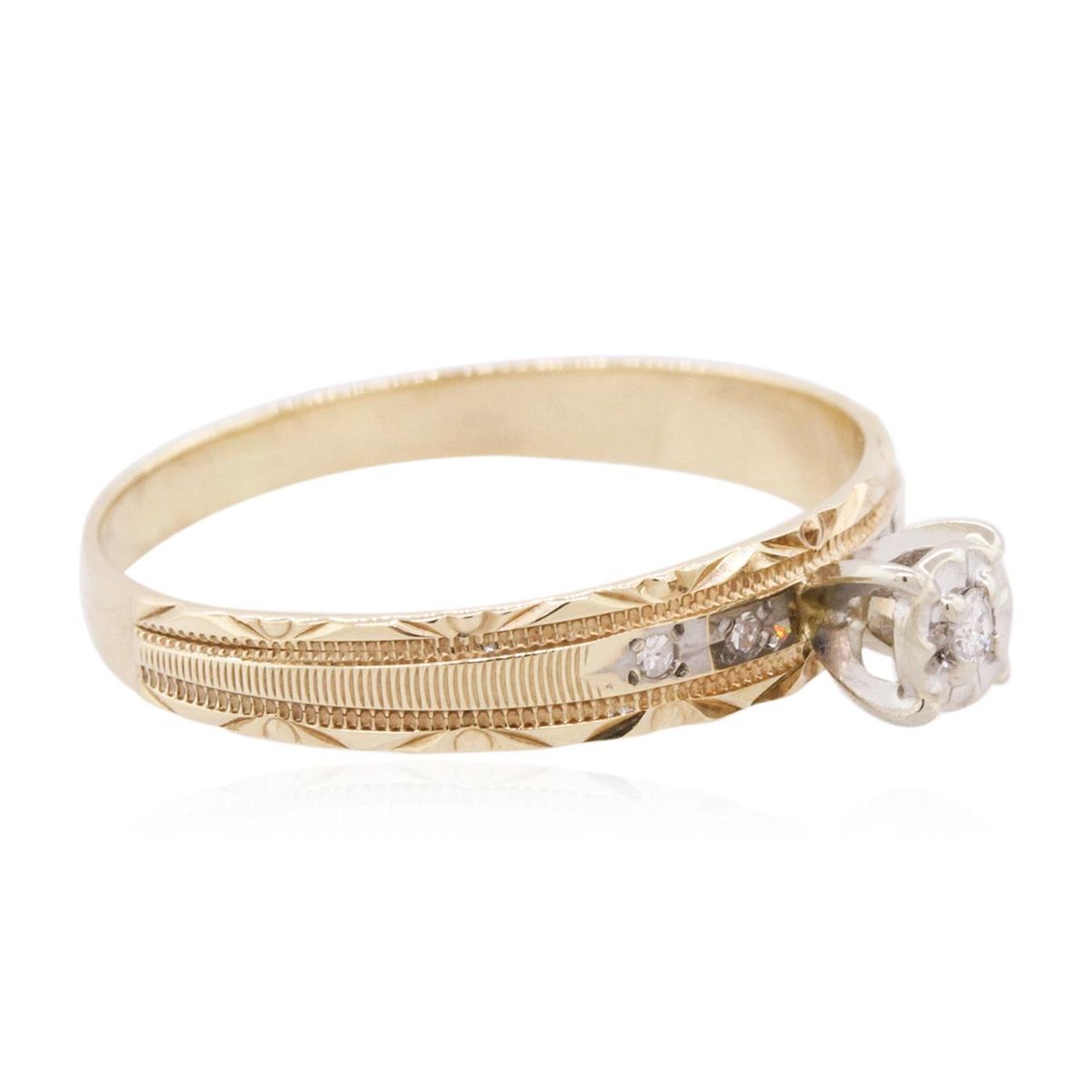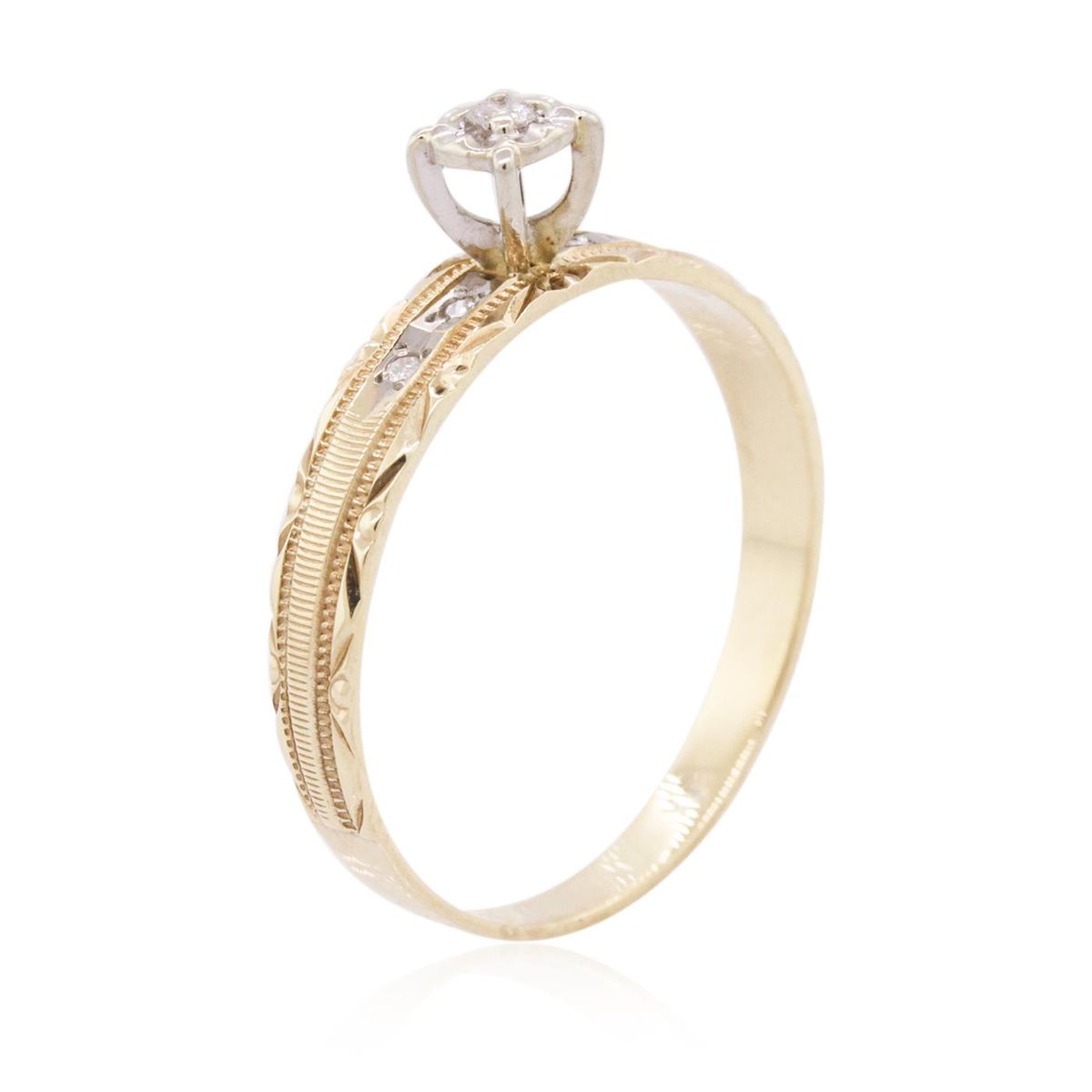 One ring featuring: 10KT yellow and white gold weighing 1.50 grams containing one round diamond center stone with a total weight of 0.01ct and round diamond side stones with a total weight of 0.02cts.