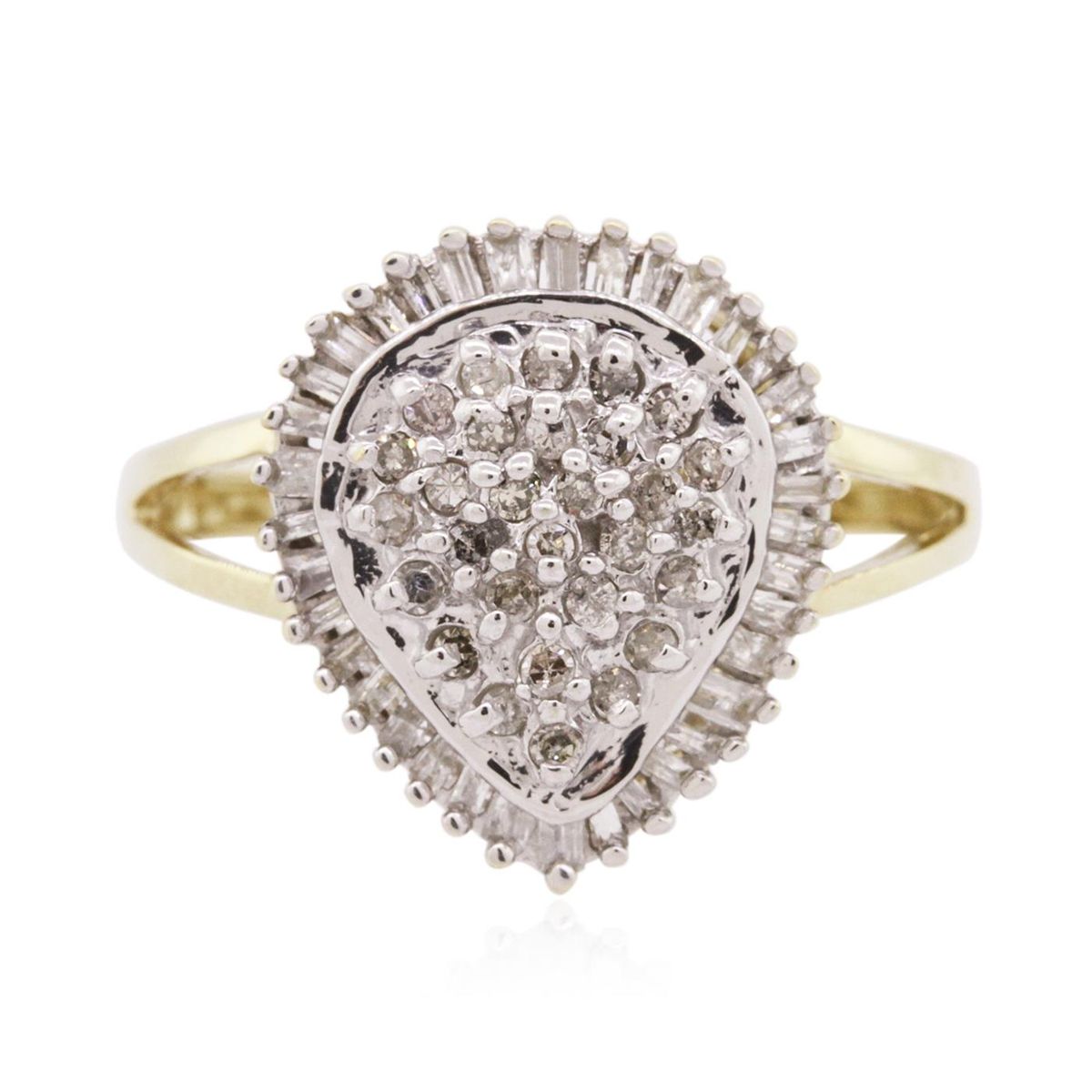 One ring featuring: 10KT yellow and white gold weighing 3.30 grams containing baguette cut/round diamonds with a total weight of 0.75cts.