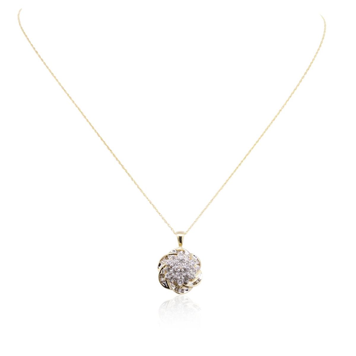 One pendant with chain featuring: 10KT two-tone gold weighing 3.40 grams containing prong set round cut/channel set baguette cut diamonds with a total weight of 1.00cts.
