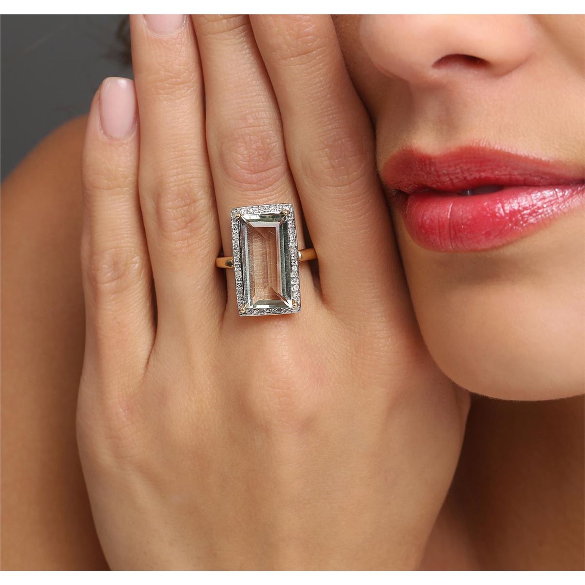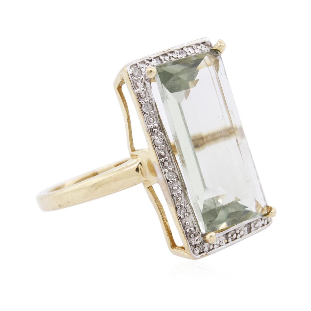 One ring featuring: 10KT two-tone gold weighing 4.70 grams containing one green amethyst center stone with a total weight of 14.00ct and round diamonds with a total weight of 0.07cts.