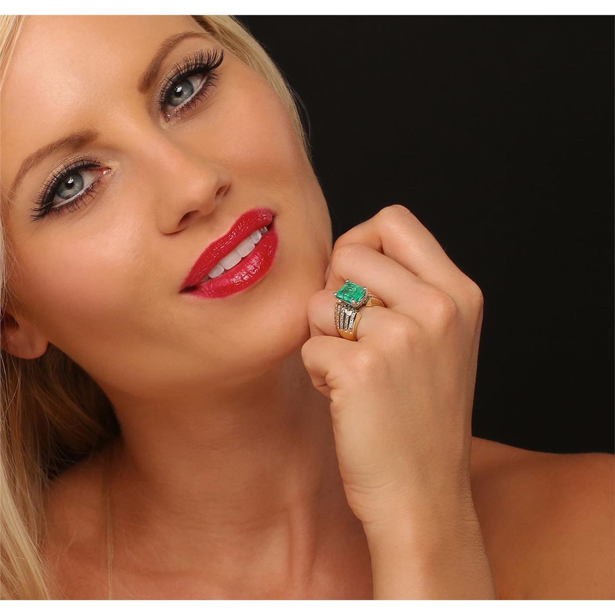 One electronically tested 10KT two-tone, white & yellow gold ladies cast & assembled emerald and diamond ring with a bright polish finish. Condition is good. The featured emerald is supported by diamond set shoulders and completed by a six and one-half millimeter wide band. Identified with markings of "10K". Containing: One prong set rectangular step cut natural emerald, measuring 10.50 x 8.80 x 5.72mm, approximate weight of 4.31ct., clarity is heavily included, type III, medium dark, moderately strong, very slightly bluish green color, (GIA vslbG 6/4), cut is good. Transmitting light with a minimum of distortion, transparent to translucent. Naturally occurring internal & external characteristics are present. Indications of oil residue. Graded in the setting. Sixty channel set round brilliant cut diamonds, measuring 2.00 - 1.70 x 1.11mm (depth est.) approximate. Total Weight of 60 Stones = 1.48ct. Graded in the setting. Clarity VVS2 to VS2; Average. Color: G - I. Total Weight of Colored Stones 4.31ct. Total Weight of Diamonds 1.48ct. Total Weight of Ring 10.30 grams. AIG Appraised at $16,470.00.