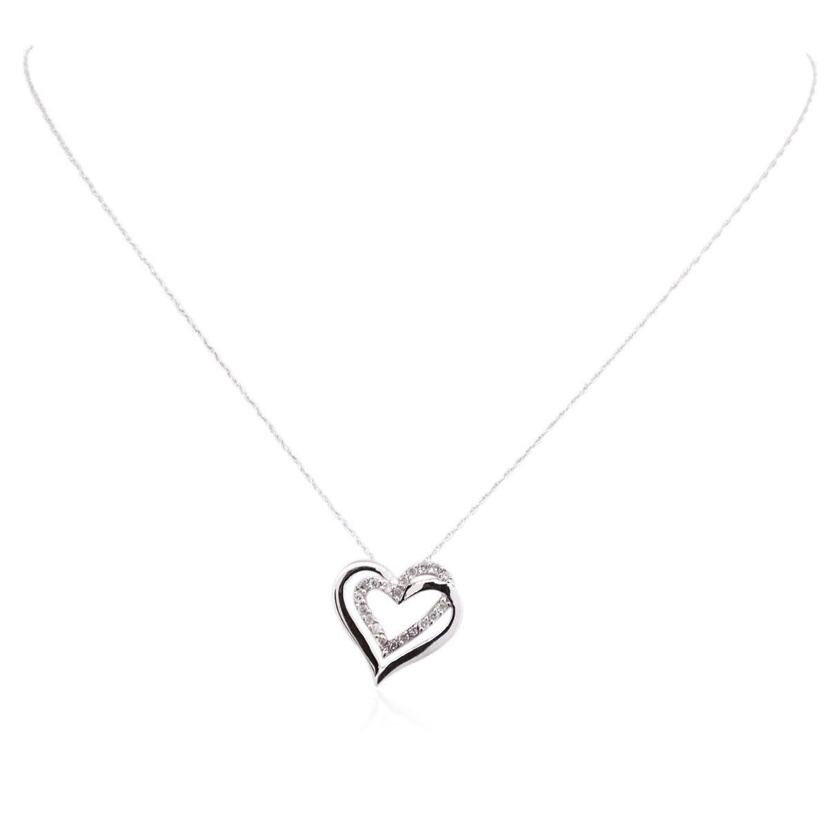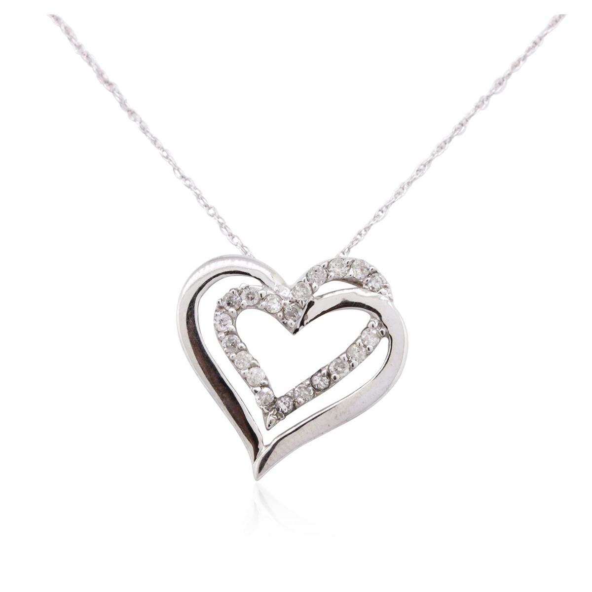 One double heart pendant with chain featuring: 10KT white gold weighing 1.40 grams containing prong set round cut diamonds with a total weight of 0.20cts.