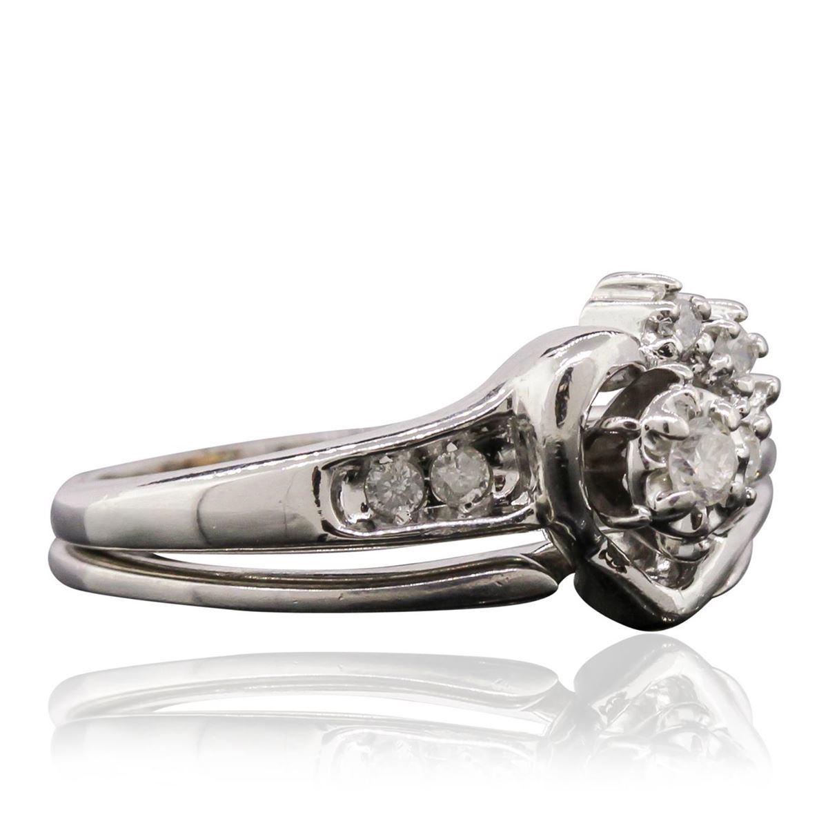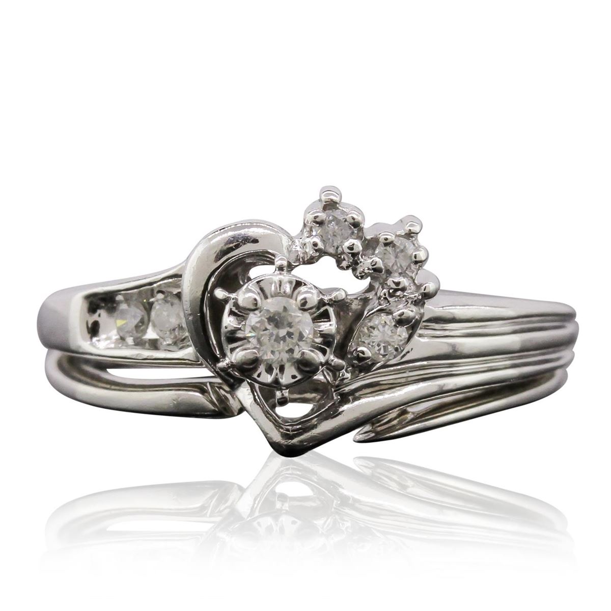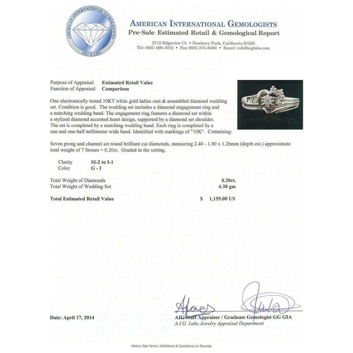 One electronically tested 10KT white gold ladies cast & assembled diamond wedding set. Condition is good. The wedding set includes a diamond engagement ring and a matching wedding band. The engagement ring features a diamond set within a stylized diamond accented heart design, supported by a diamond set shoulder. The set is completed by a matching wedding band. Each ring is completed by a one and one-half millimeter wide band. Identified with markings of "10K". Containing: Seven prong and channel set round brilliant cut diamonds, measuring 2.40 - 1.80 x 1.26mm (depth est.) approximate. Total Weight of 7 Stones = 0.20ct. Graded in the setting. Clarity: SI-2 to I-1. Color: G - I. Total Weight of Diamonds 0.20ct. Total Weight of Wedding Set 4.38 grams. AIG Appraised at $1,155.00.