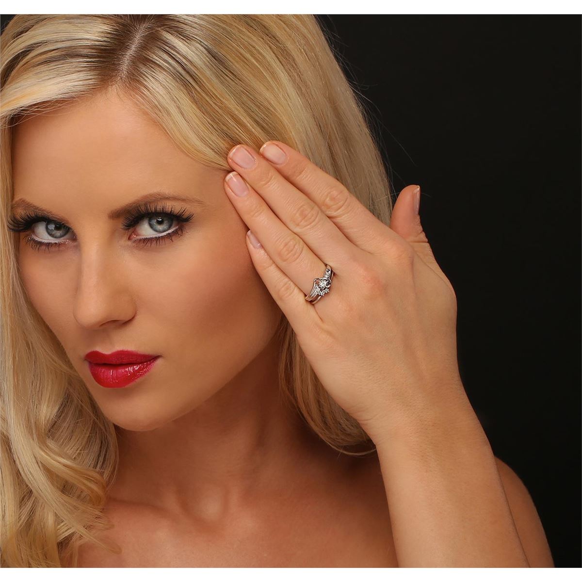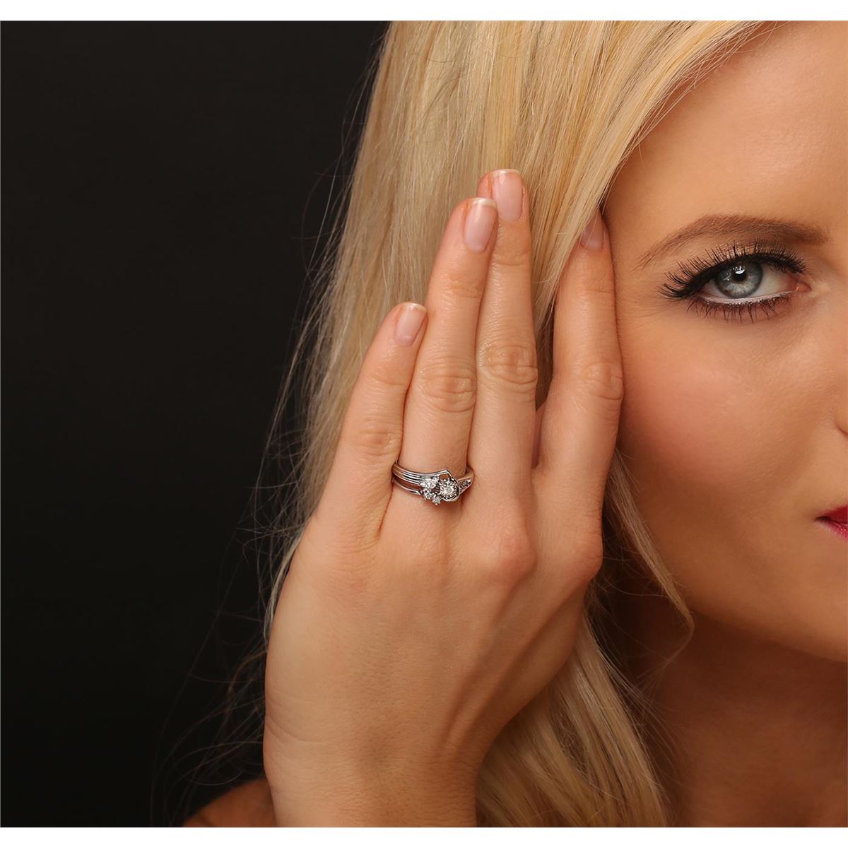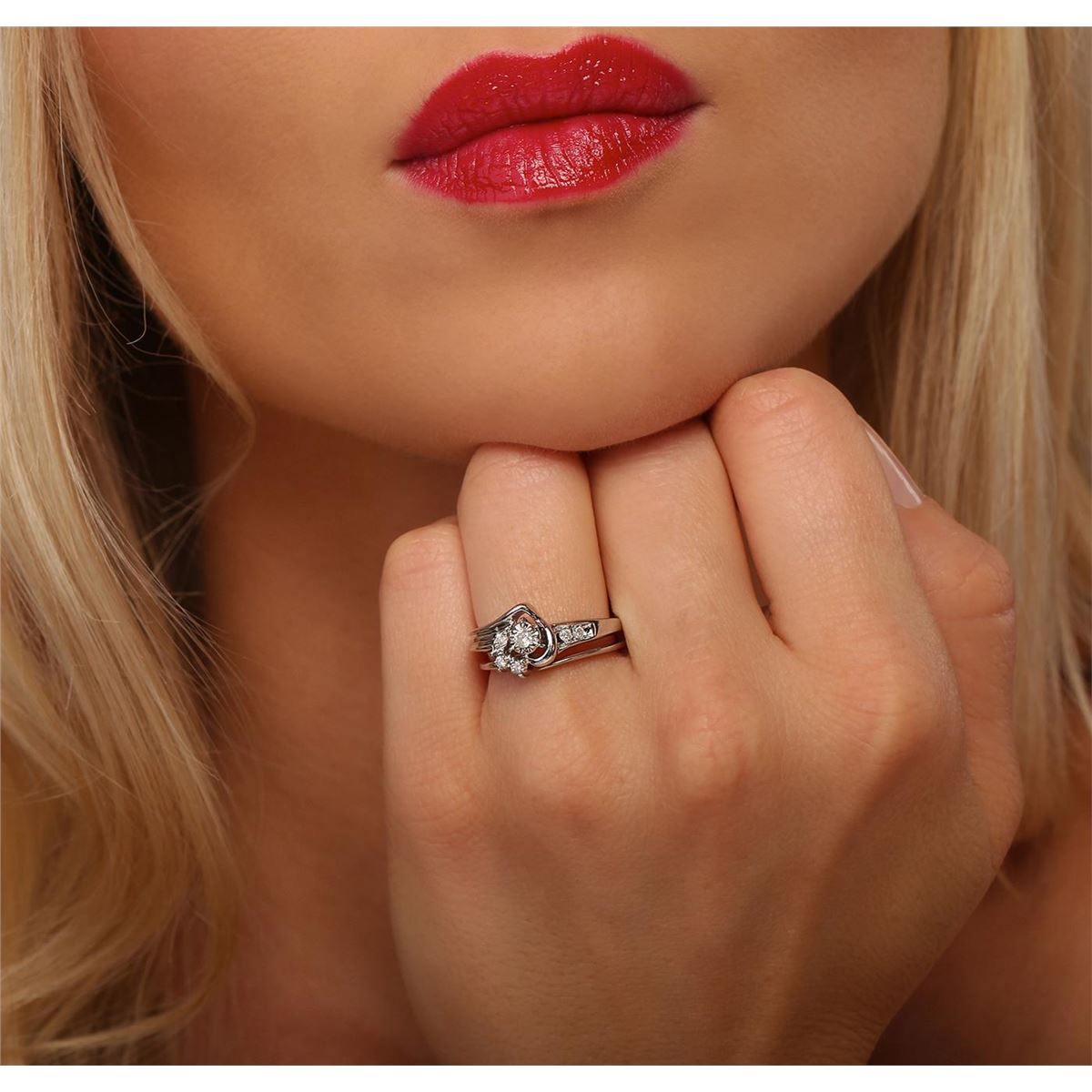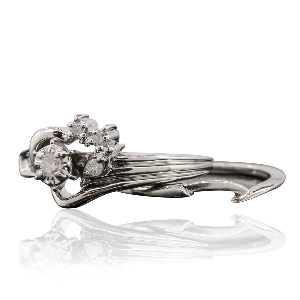 One electronically tested 10KT white gold ladies cast & assembled diamond wedding set. Condition is good. The wedding set includes a diamond engagement ring and a matching wedding band. The engagement ring features a diamond set within a stylized diamond accented heart design, supported by a diamond set shoulder. The set is completed by a matching wedding band. Each ring is completed by a one and one-half millimeter wide band. Identified with markings of "10K". Containing: Seven prong and channel set round brilliant cut diamonds, measuring 2.40 - 1.80 x 1.26mm (depth est.) approximate. Total Weight of 7 Stones = 0.20ct. Graded in the setting. Clarity: SI-2 to I-1. Color: G - I. Total Weight of Diamonds 0.20ct. Total Weight of Wedding Set 4.38 grams. AIG Appraised at $1,155.00.