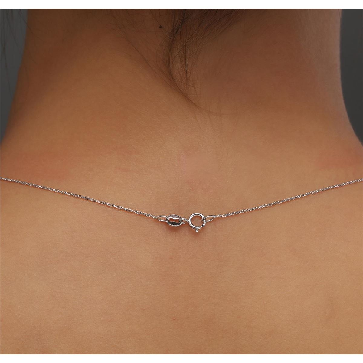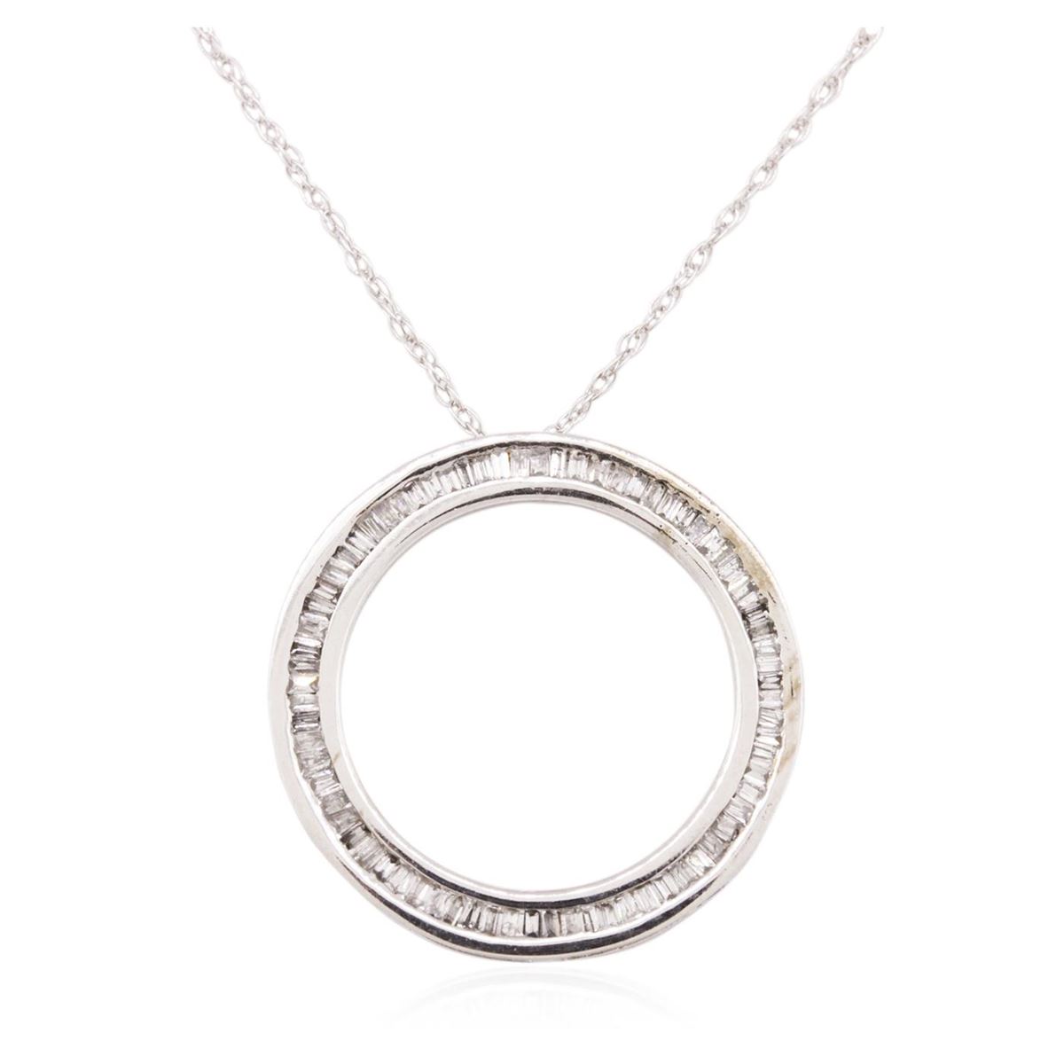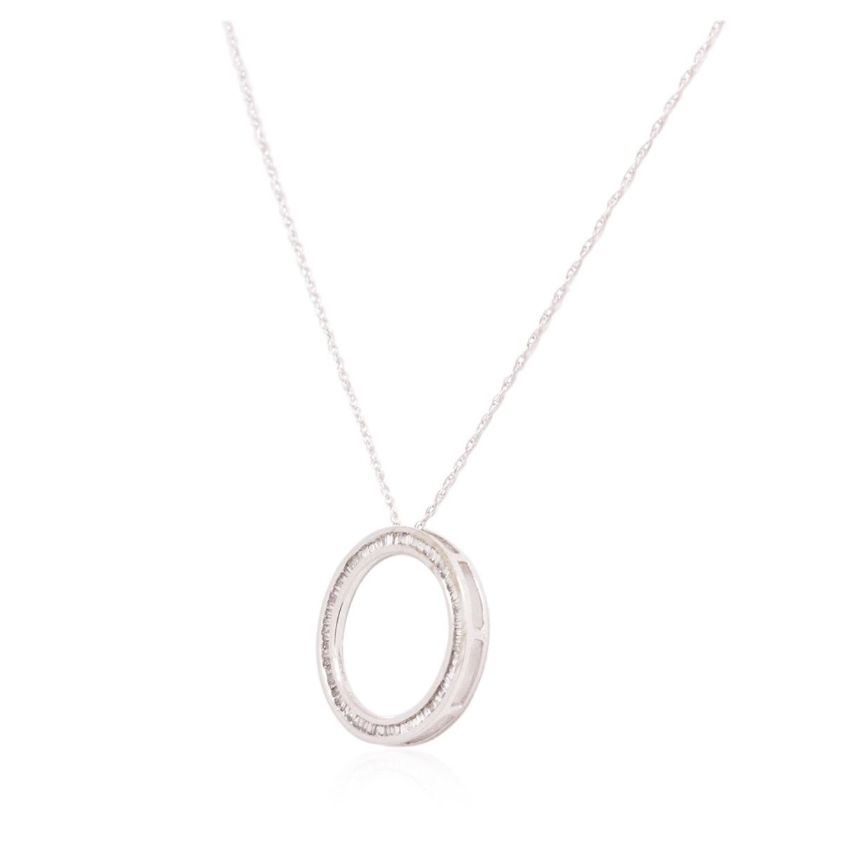 One circle pendant with chain featuring: 10KT white gold weighing 1.86 grams containing baguette cut diamonds with a total weight of 0.35cts.