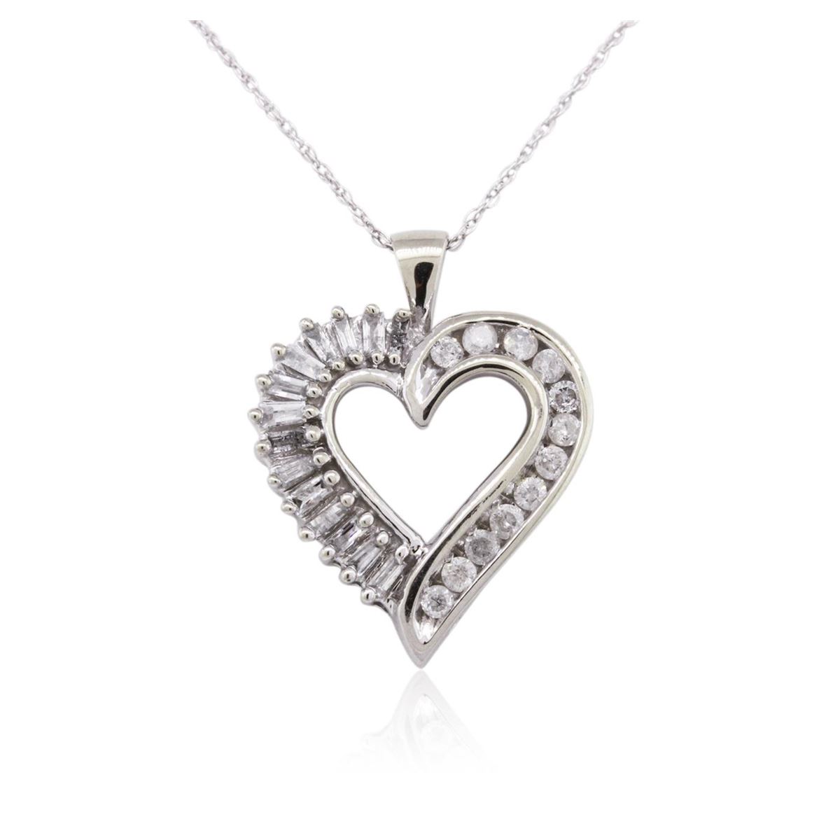 One heart pendant with chain featuring: 10KT white gold weighing 2.54 grams containing prong set baguette cut/channel set round cut diamonds with a total weight of 0.50cts.
