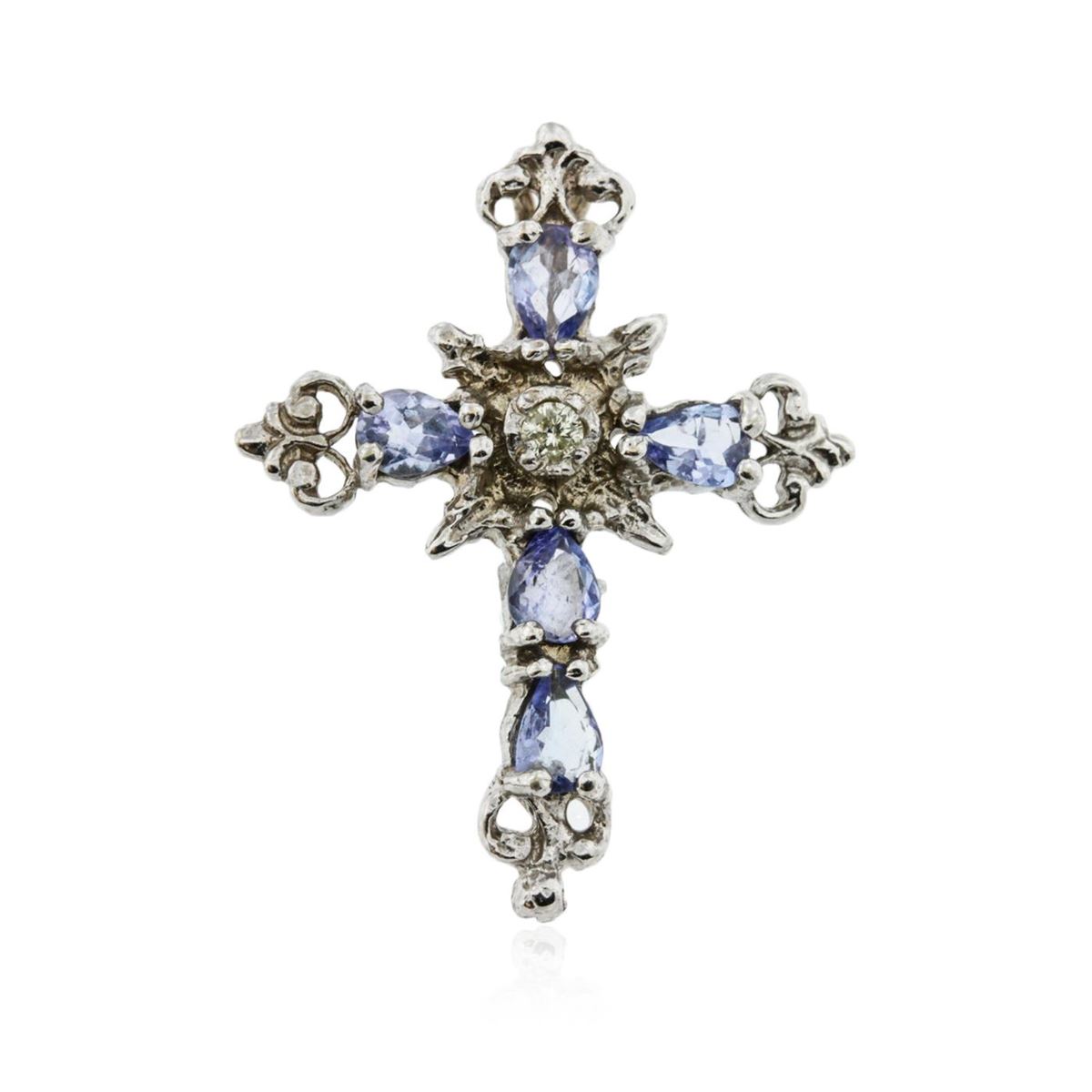 One cross pendant featuring: 10KT white gold weighing 1.80 grams containing five tanzanites with a total weight of 1.25ct and one round diamond with a total weight of 0.03ct.