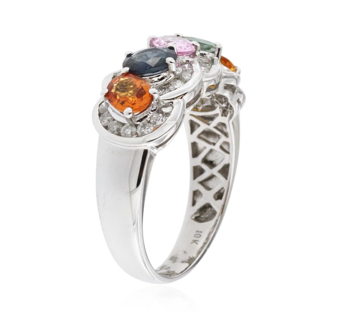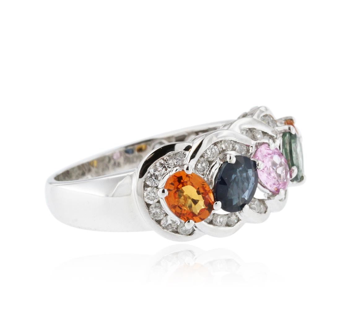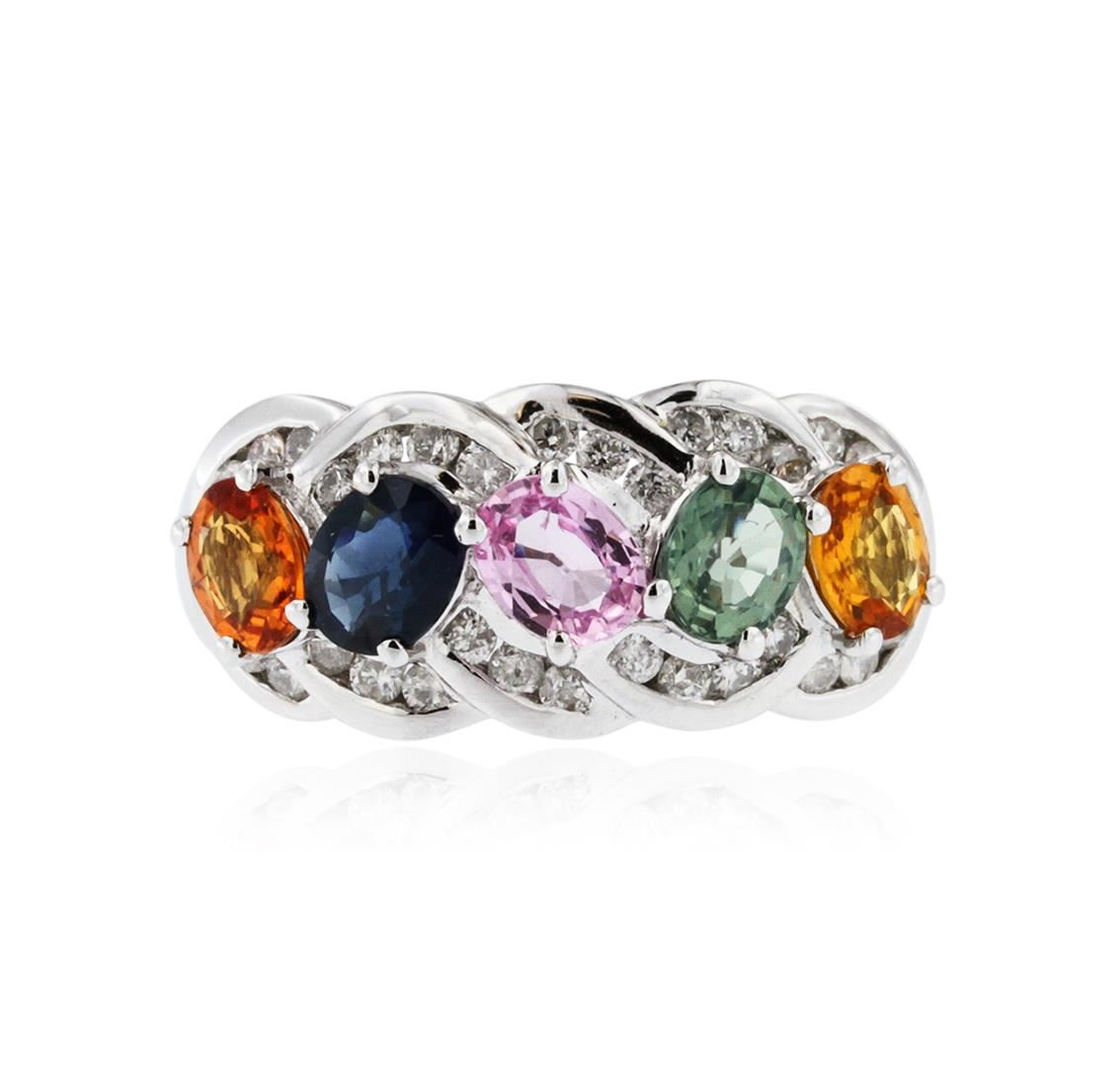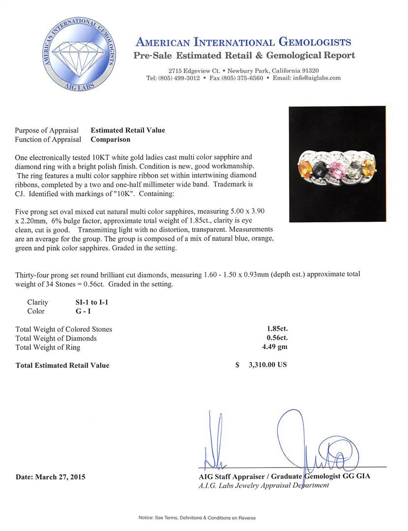 One electronically tested 10KT white gold ladies cast multi color sapphire and diamond ring with a bright polish finish. The ring features a multi color sapphire ribbon set within intertwining diamond ribbons, completed by a two and one-half millimeter wide band. Trademark is CJ. Identified with markings of "10K". Condition is new, good workmanship. Containing: Five prong set oval mixed cut natural multi color sapphires, measuring 5.00 x 4.00 x 2.20mm, 6% bulge factor, approximate total weight of 1.90ct., clarity is eye clean, cut is good. Transmitting light with no distortion, transparent. Measurements are an average for the group. The group is composed of a mix of natural blue, orange, green and pink color sapphires. Graded in the setting. Thirty-Four channel set round brilliant cut diamonds, measuring 1.60 - 1.50 x 0.93mm (depth est.) approximate total weight of 34 Stones = 0.56ct. Graded in the setting. Clarity: SI-1 to I-1. Color: G - I. Total Weight of Colored Stones 1.90ct. Total Weight of Diamonds 0.56ct. Total Weight of Ring 4.42 grams. AIG Appraised at $3,385.00.