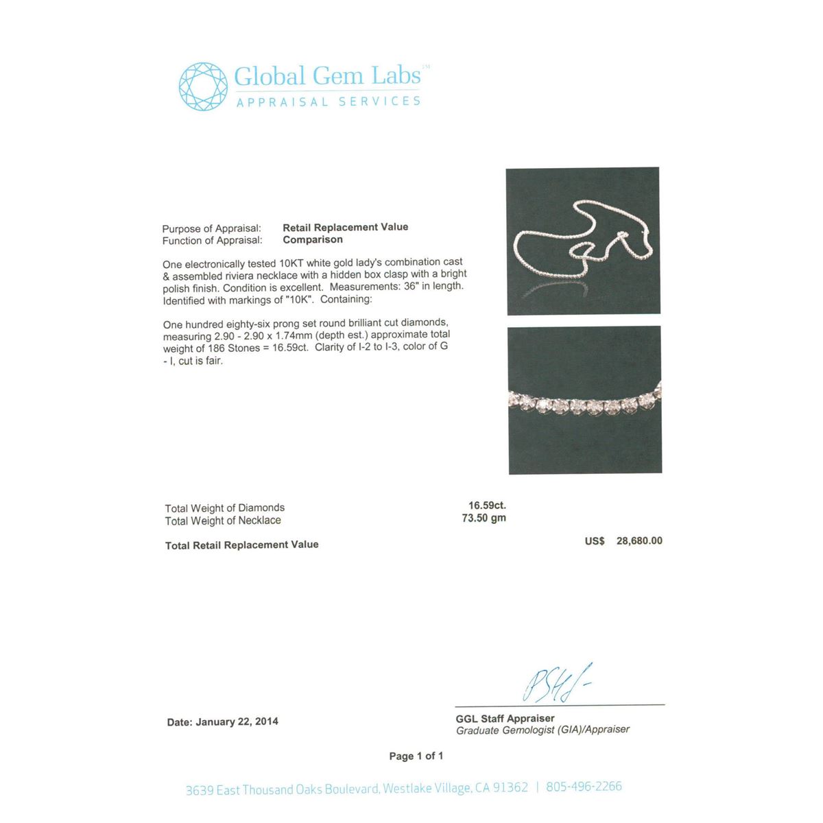One electronically tested 10KT white gold Ladies combination cast & assembled riviera necklace with a hidden box clasp with a bright polish finish. Measurements: 36" in length. Identified with markings of "10K". Condition is excellent. Containing: One Hundred Eighty-Six prong set round brilliant cut diamonds, measuring 2.90 - 2.90 x 1.74mm (depth est.) approximate total weight of 186 Stones = 16.59ct. Clarity of I-2 to I-3, Color of G - I, Cut is Fair. Total Weight of Diamonds 16.59ct. Total Weight of Necklace73.50gm. GGL Appraised at $28,680.00.