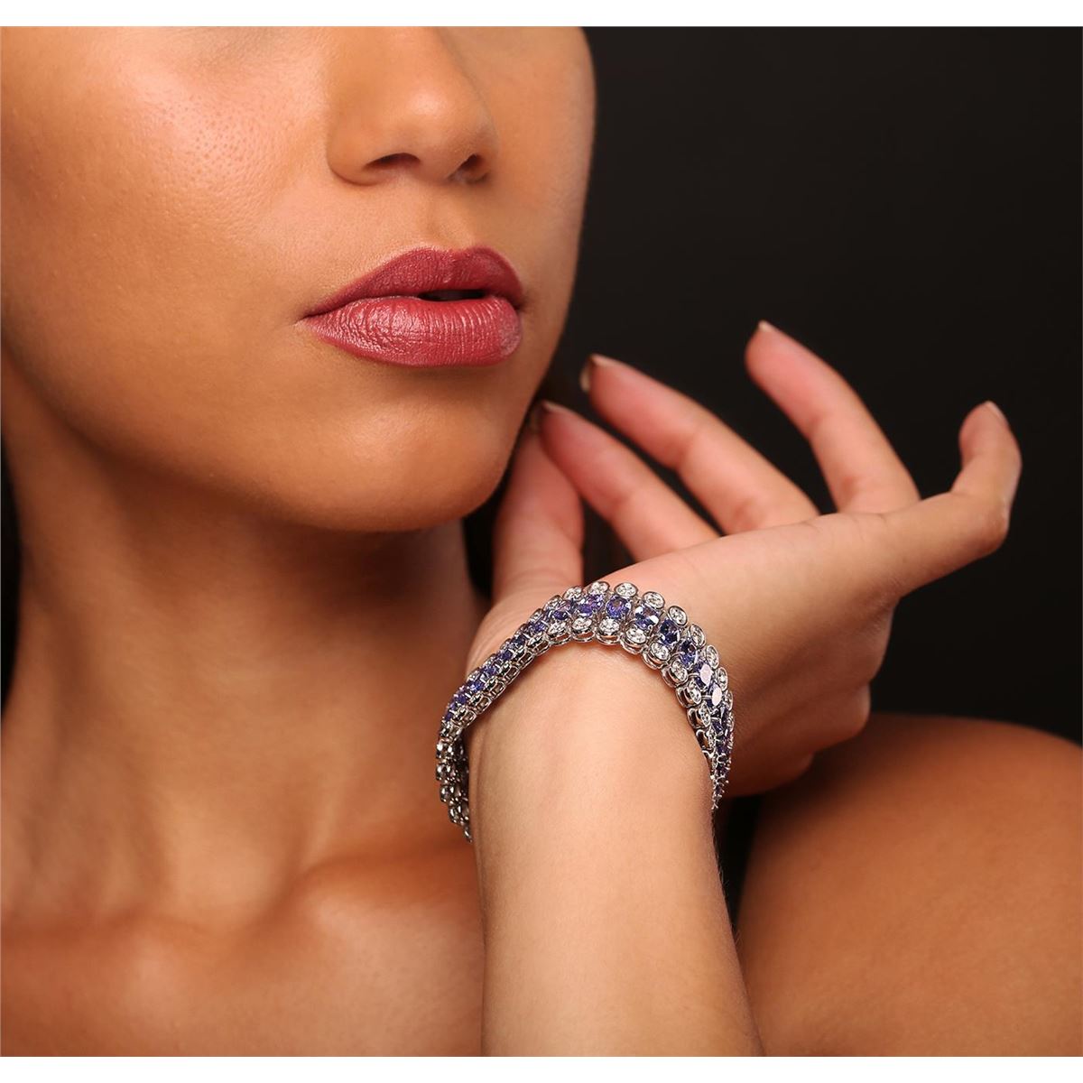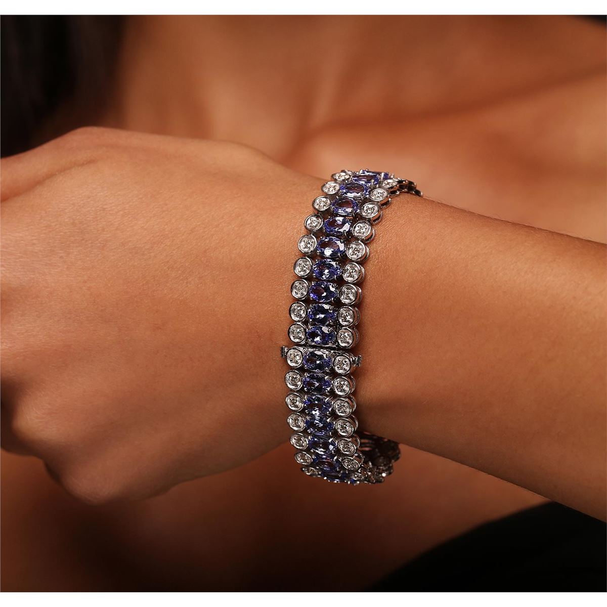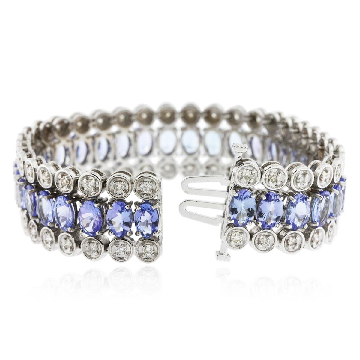 One electronically tested 10KT white gold Ladies combination cast & assembled fashion bracelet with a hidden box clasp with a high polish finish. Condition is new. Measurements: 7" in length, 0.65" wide. Containing: Thirty-five prong set oval modified mixed cut natural tanzanites, measuring 6.90 x 4.90 x 2.40mm, approximate. Total Weight of 20.84ct., clarity is eye clean, type I, medium light, very slightly grayish, violet color, (GIA V 4/3), cut is very good. Colored gemstones are presumed to have been subjected to commonly used color/clarity enhancement processes. Seventy prong set round brilliant cut diamonds, measuring 1.90 - 1.90 x 1.14mm (depth est.) approximate. Total Weight of 70 Stones = 1.76ct. Clarity: VS-2 to SI-1. Color: I - J, Cut is Good. Total Weight of Colored Stones 20.84ct. Total Weight of Diamonds 1.76ct. Total Weight of Bracelet 44.10 grams. GGL Appraised at $27,350.00.