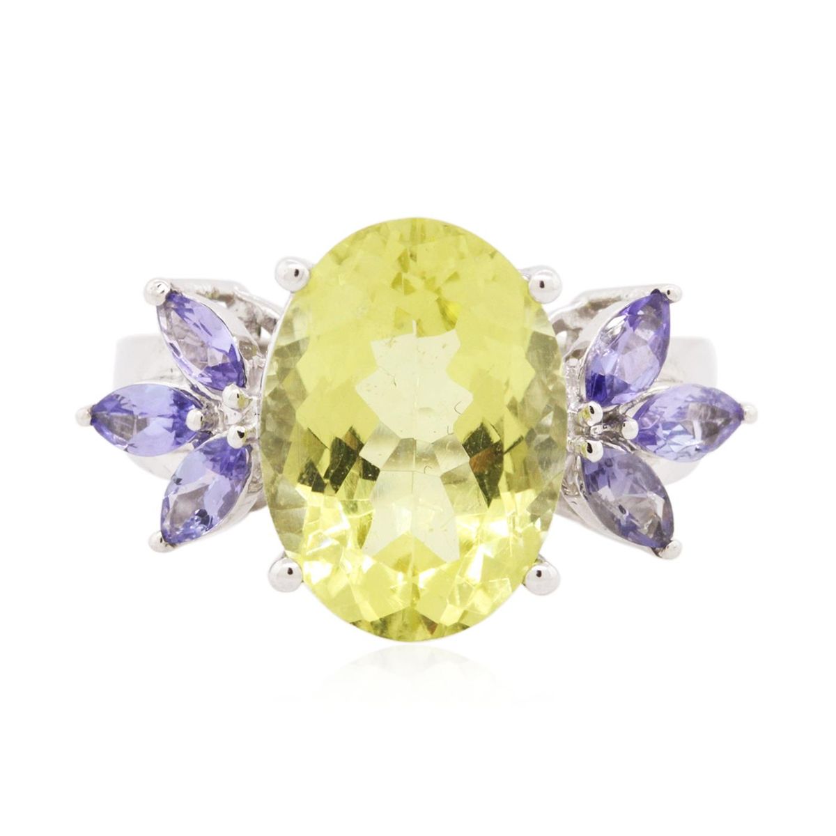 One ring featuring: 10KT white gold weighing 5.00 grams containing one lemon quartz center stone with a total weight of 6.00ct and six tanzanites with a total weight of 0.84cts.