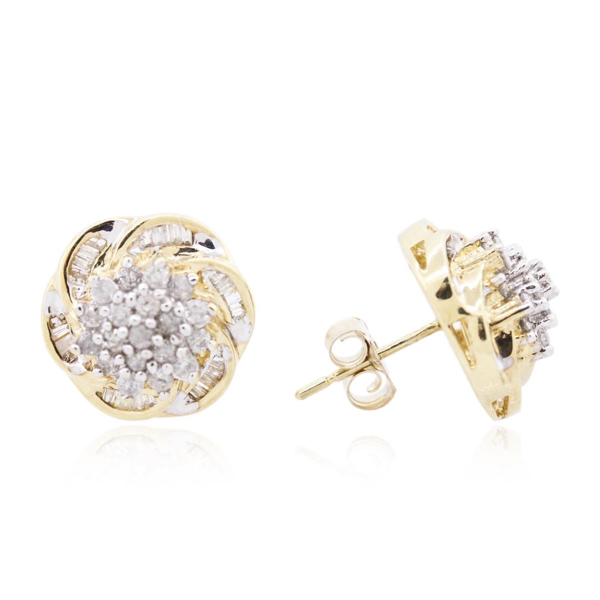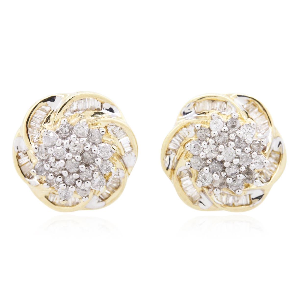 One pair of earrings featuring: 10KT yellow gold weighing 4.30 grams containing round cut/baguette cut diamonds with a total weight of 0.25cts.