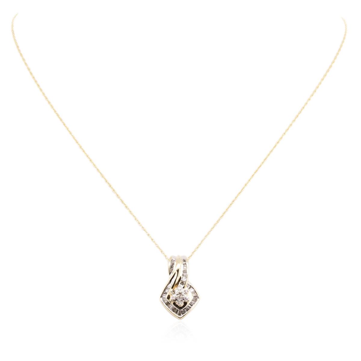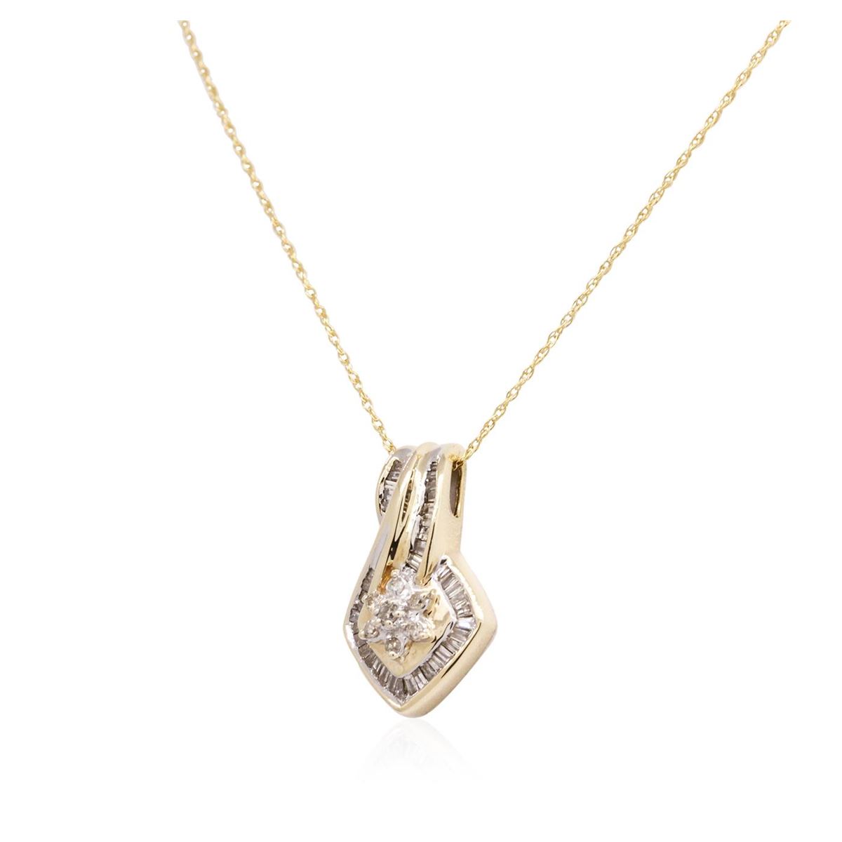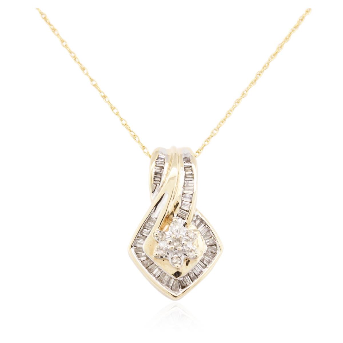 One pendant with chain featuring: 10KT yellow gold weighing 2.70 grams containing round/baguette cut diamonds with a total weight of 0.50cts.