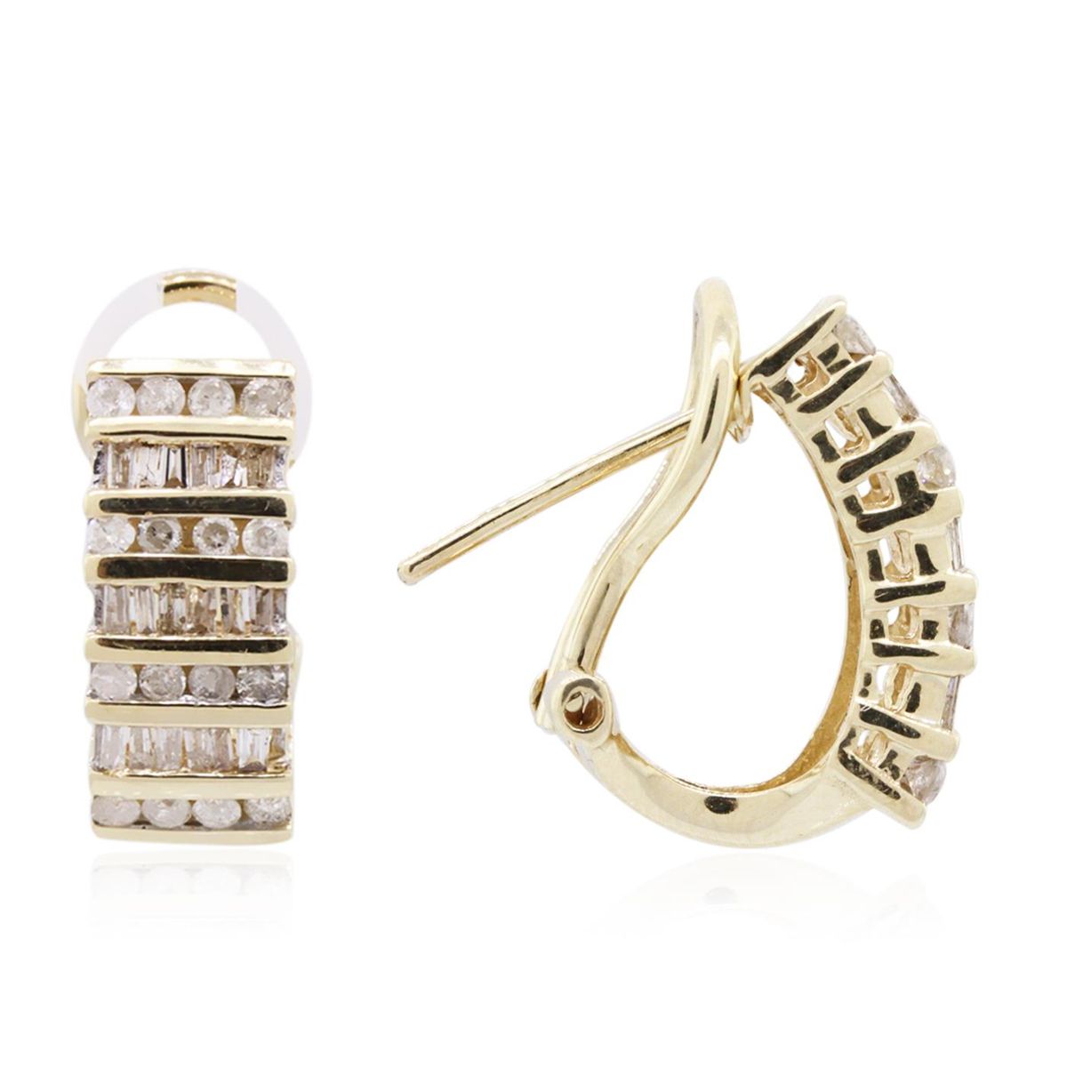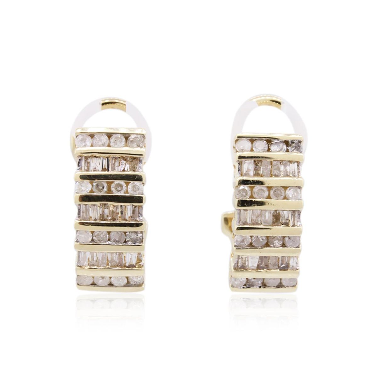 One pair of earrings featuring: 10KT yellow gold weighing 5.80 grams containing baguette cut/round cut diamonds with a total weight of 0.75cts.