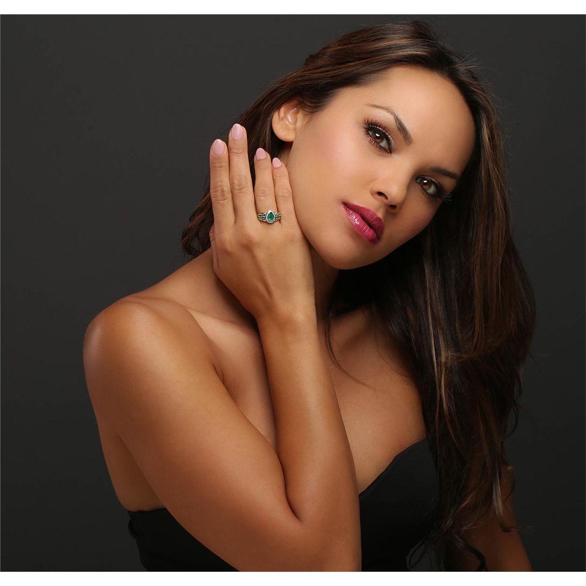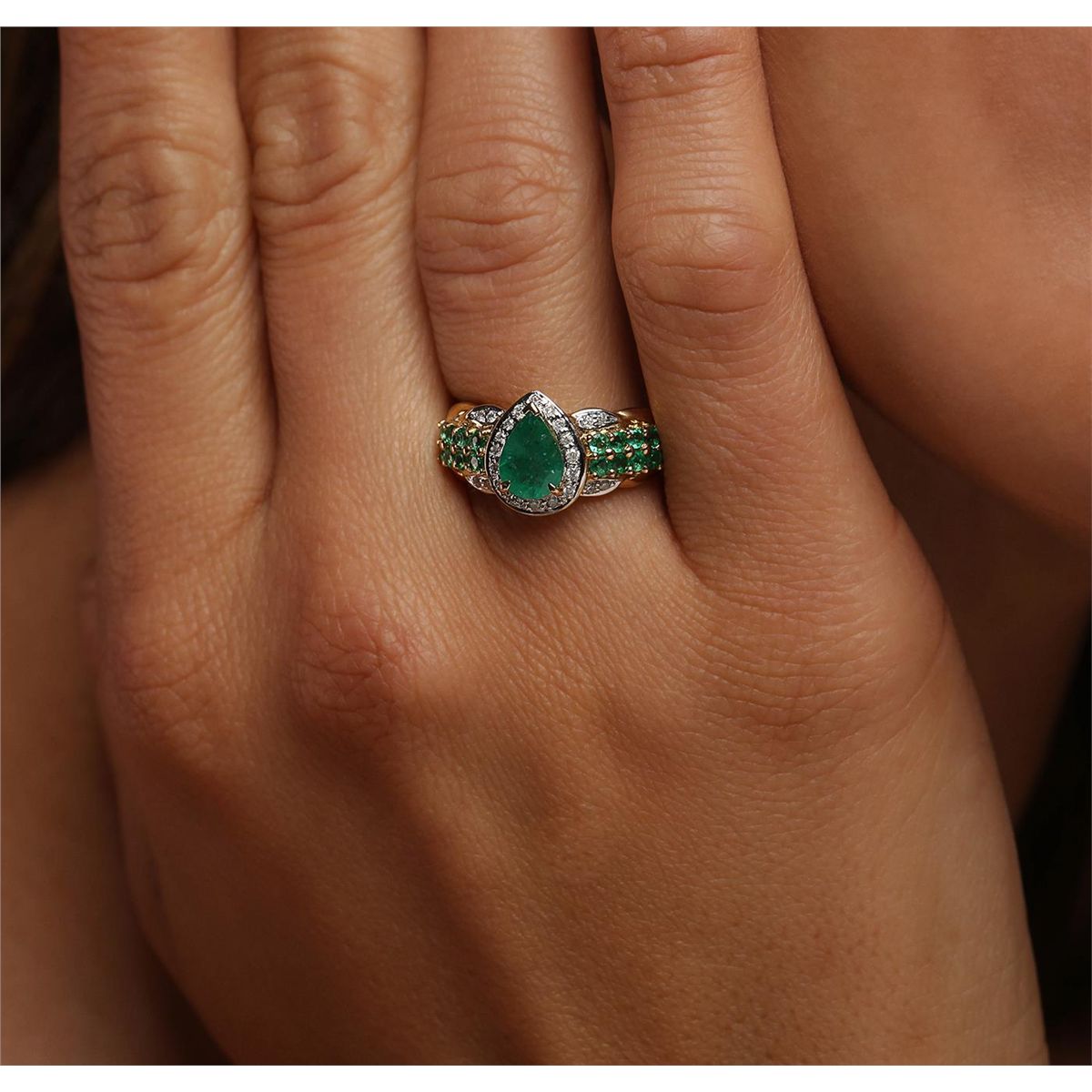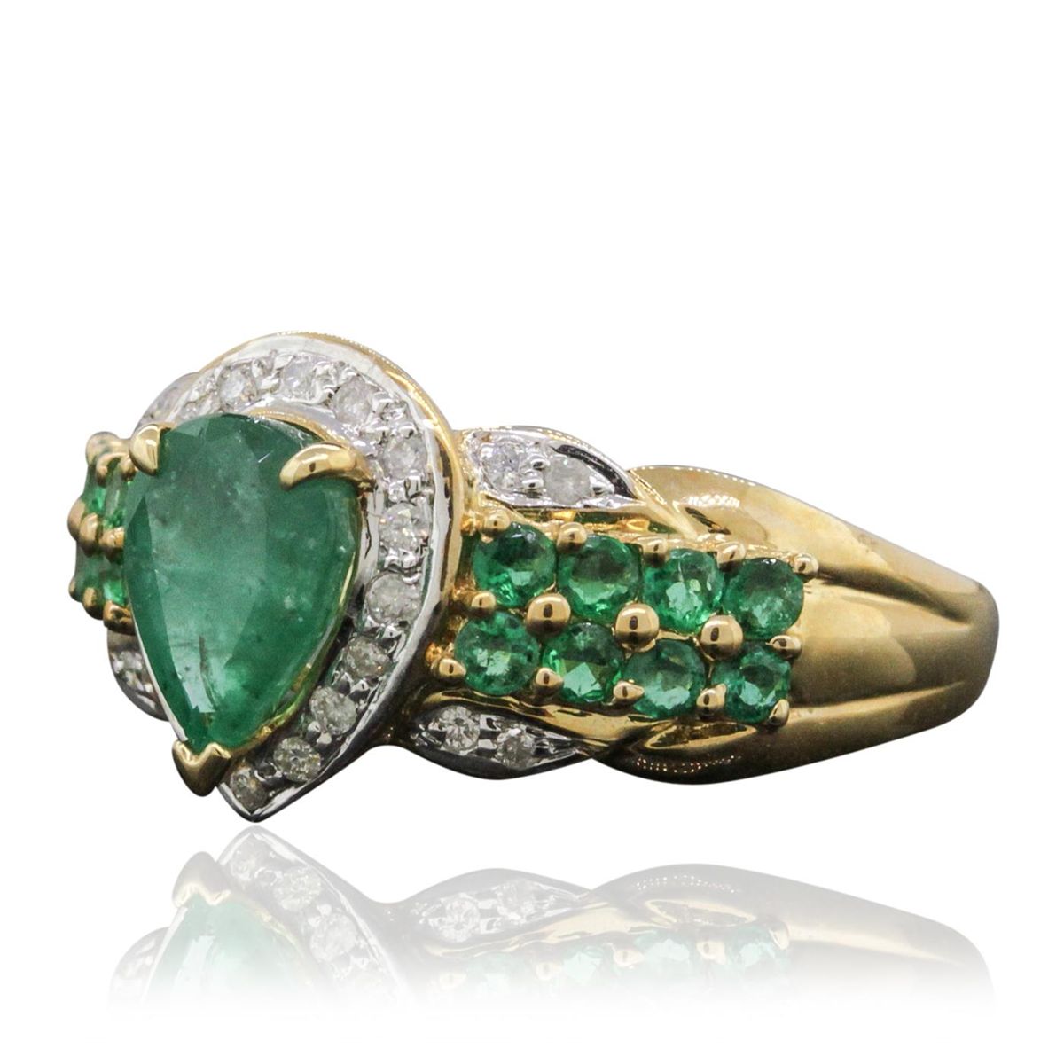 One ring featuring: 10KT yellow gold weighing 2.68 grams containing one emerald with a total weight of 1.24ct, 16 emeralds with a total weight of 0.40cts, and 24 round cut diamonds with a total weight of 0.14cts.