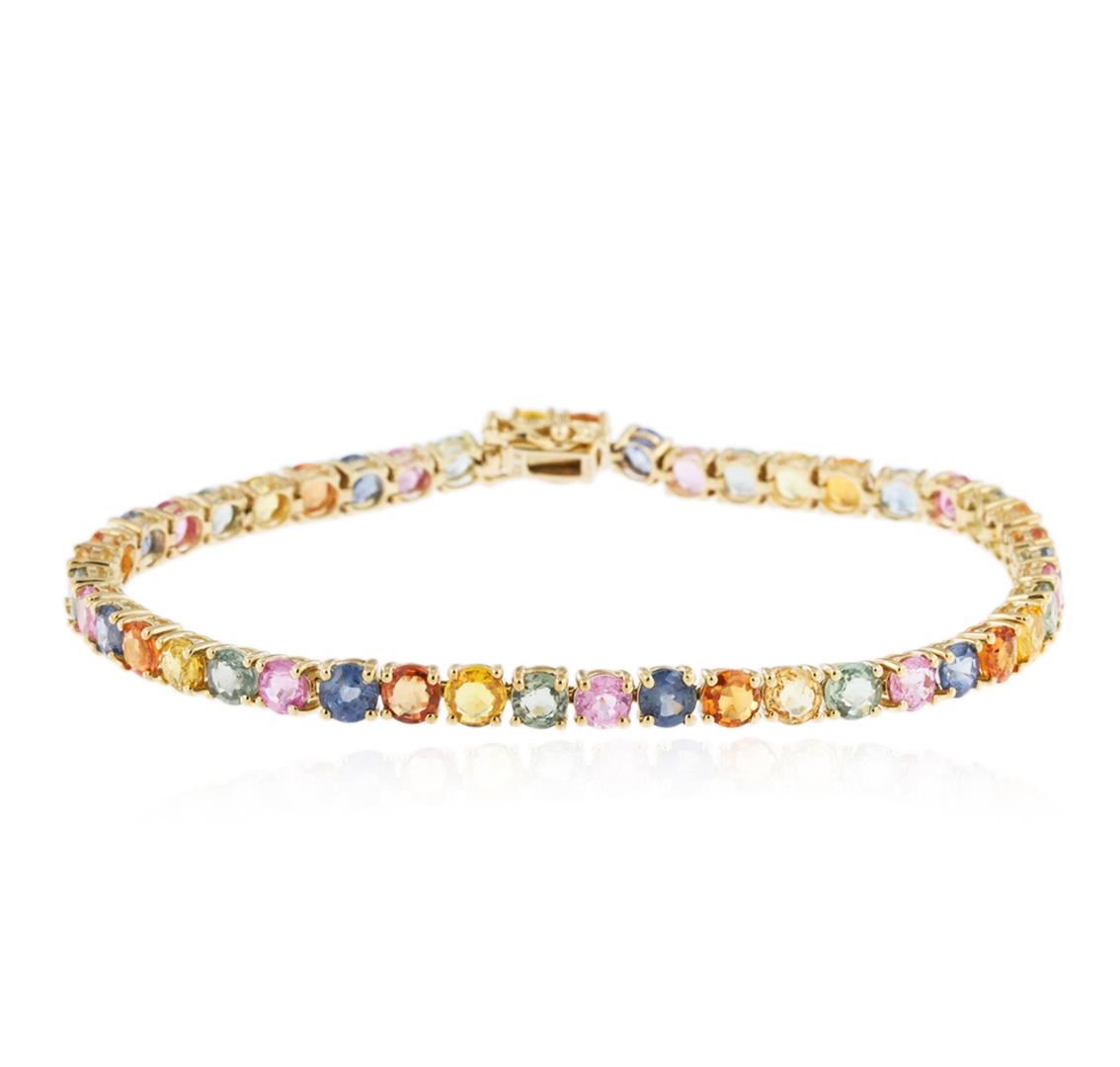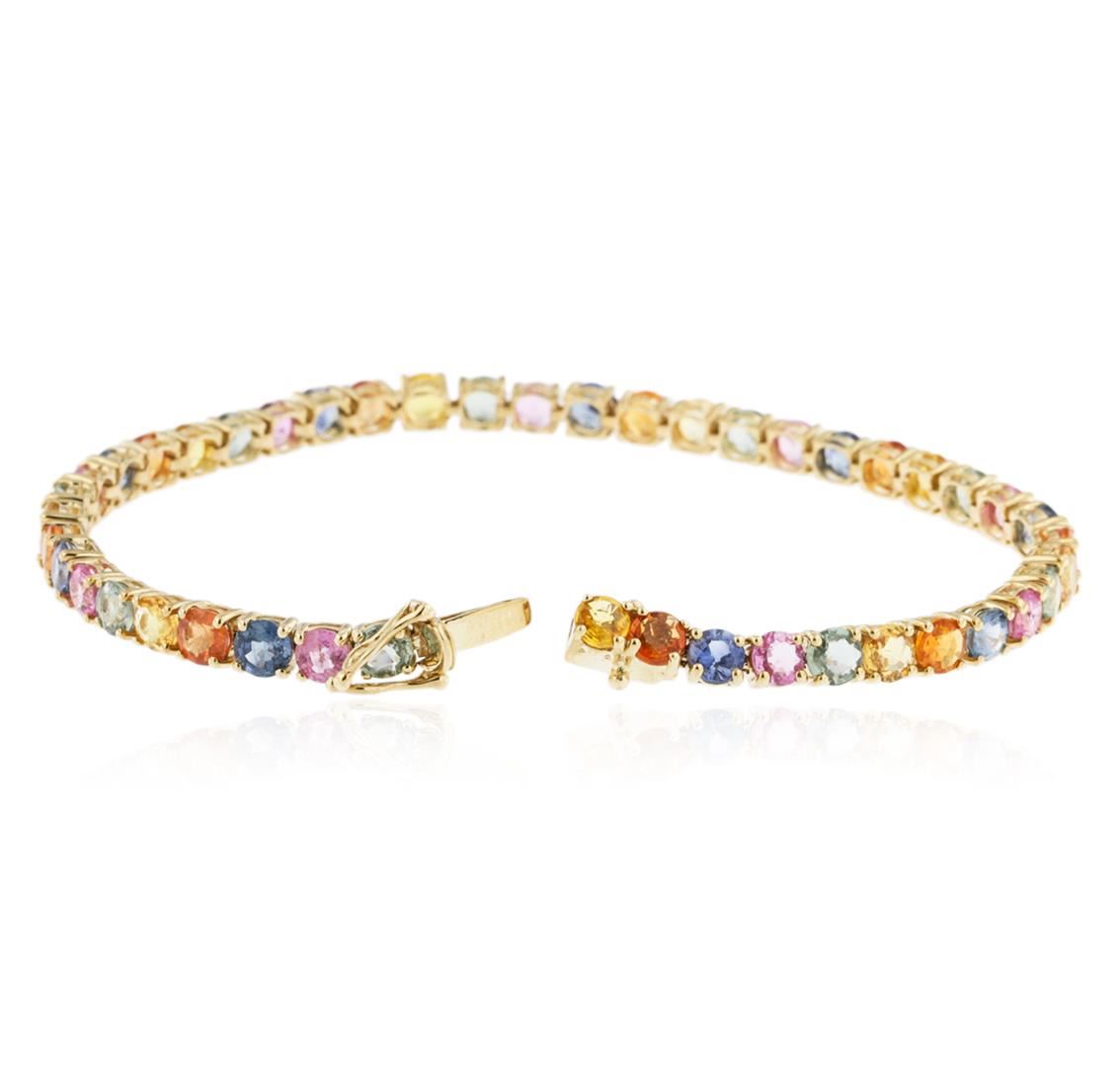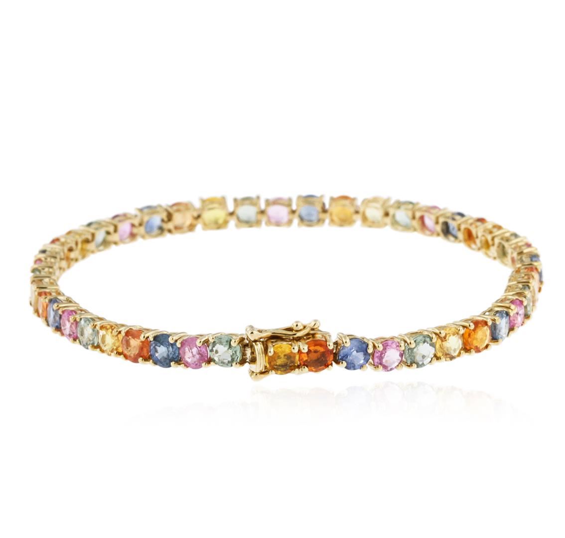 One electronically tested 10KT yellow gold ladies cast & assembled multi color sapphire bracelet with a bright polish finish. Seven and one-half inch length bracelet features a flexible multi color sapphire ribbon, terminating in a concealed clasp with twin safeties. Bright polish finish. Identified with markings of "10K". Condition is new, good workmanship. Containing: Forty-five prong set round mixed cut natural multi color sapphires, measuring 4.10 - 3.90 x 2.50 mm, 8% bulge factor, approximate total weight of 16.20ct., clarity is slightly included, cut is good. Transmitting light with a minimum of distortion, transparent. Naturally occurring internal & external characteristics are present. The group is composed of a mix of natural blue, orange, green, pink and yellow color sapphires. Graded in the setting. Total Weight of Colored Stones 16.20ct. Total Weight of Bracelet 9.83 grams. AIG Appraised at $11,435.00.