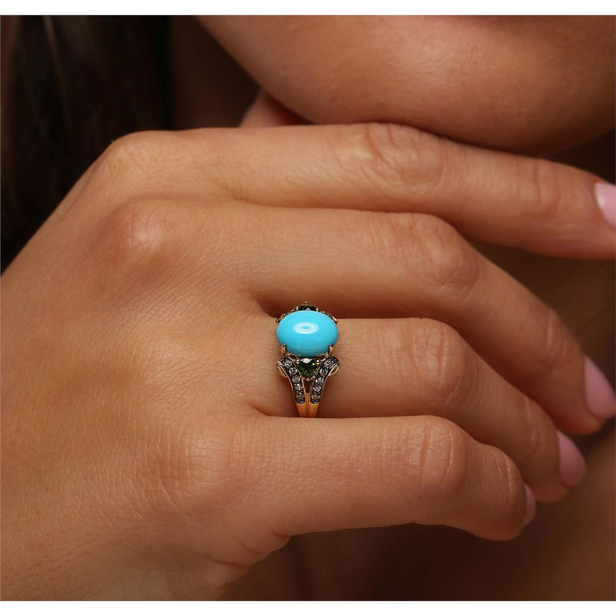 One ring featuring: 10KT yellow gold weighing 1.96 grams containing one turquoise with a total weight of 2.07ct, two tsavorites with a total weight of 0.41cts, and 20 diamonds with a total weight of 0.17cts.