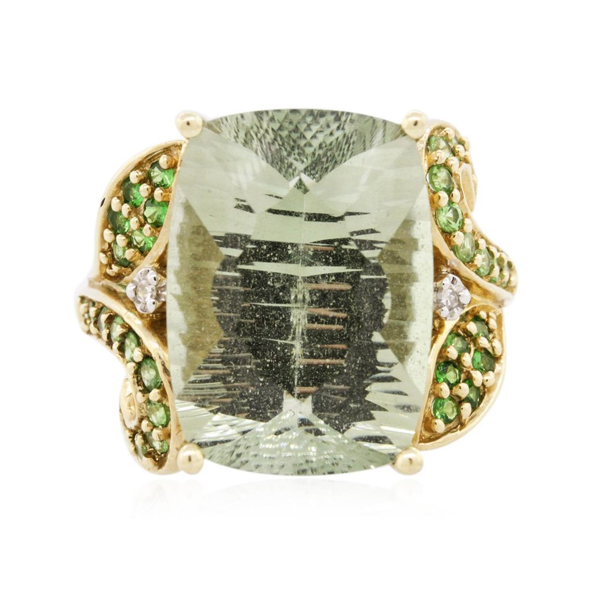 One ring featuring: 10KT yellow gold weighing 9.10 grams containing one green amethyst center stone with a total weight of 20.00ct, peridots with a total weight of 0.30cts, and round diamonds with a total weight of 0.02cts.