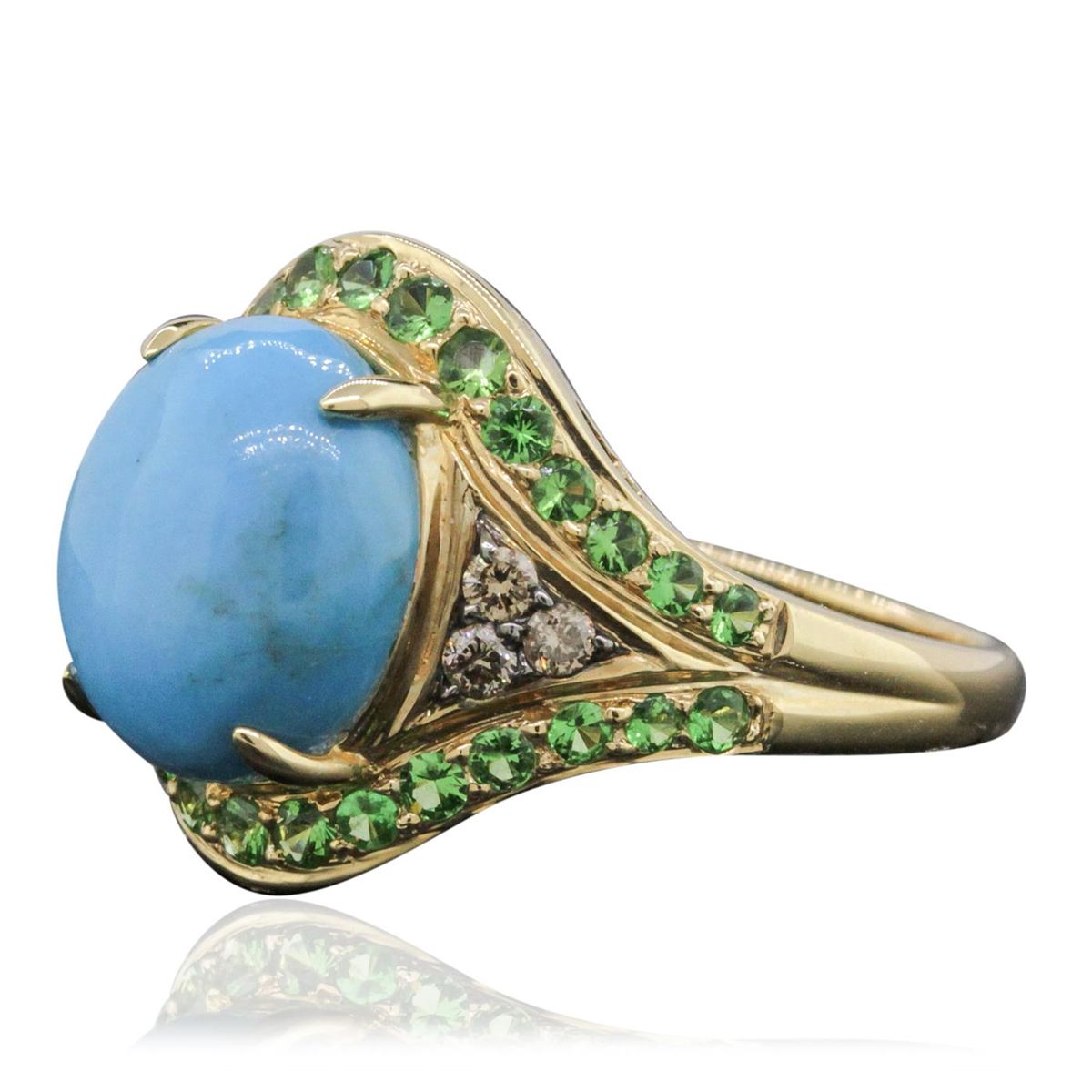 One ring featuring: 10KT yellow gold weighing 2.87 grams containing one turquoise with a total weight of 3.36ct, 30 tsavorites with a total weight of 0.63cts, and 6 round cut diamonds with a total weight of 0.15cts.