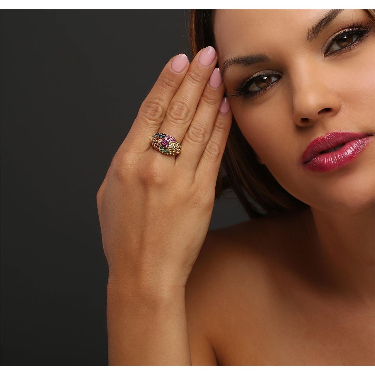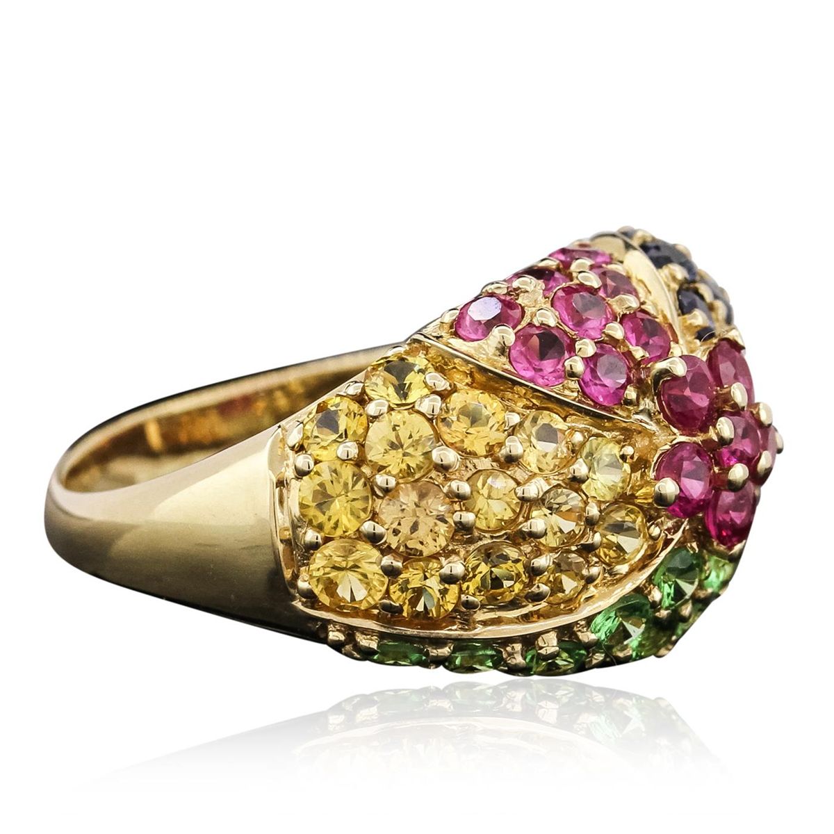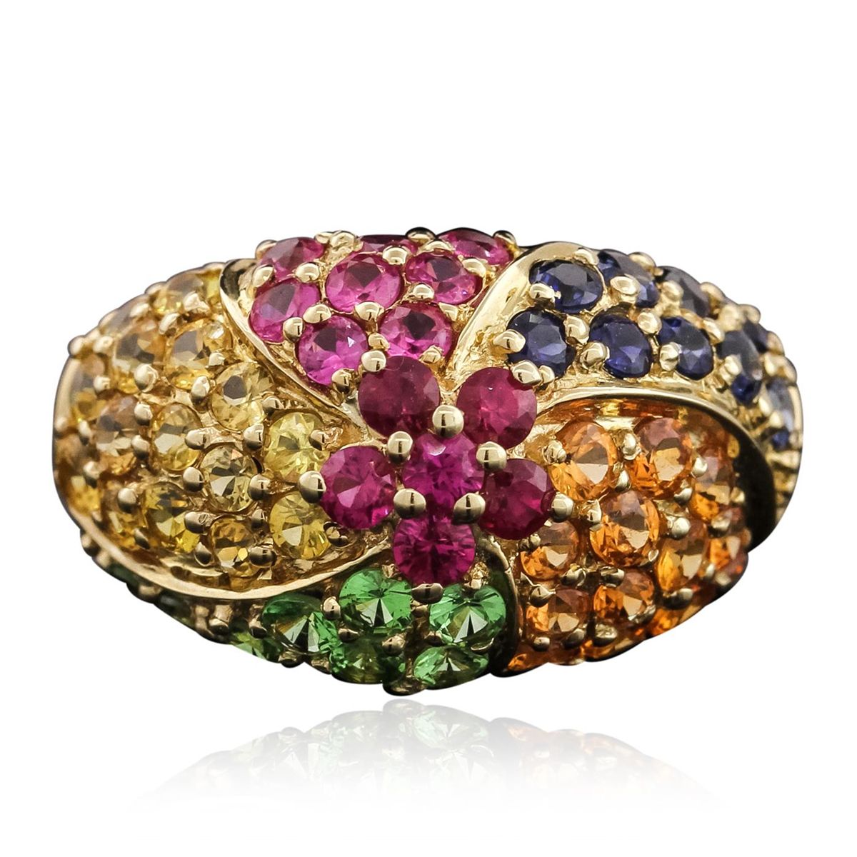 One ring featuring: 10KT yellow gold weighing 3.53 grams containing six hot pink rubies with a total weight of 0.46cts, eight pink sapphires with a total weight of 0.44cts, 10 tsavorites with a total weight of 0.56cts, 13 orange sapphires with a total weight of 0.88cts, nine blue sapphires with a total weight of 0.55cts, and 15 yellow sapphires with a total weight of 0.97cts.