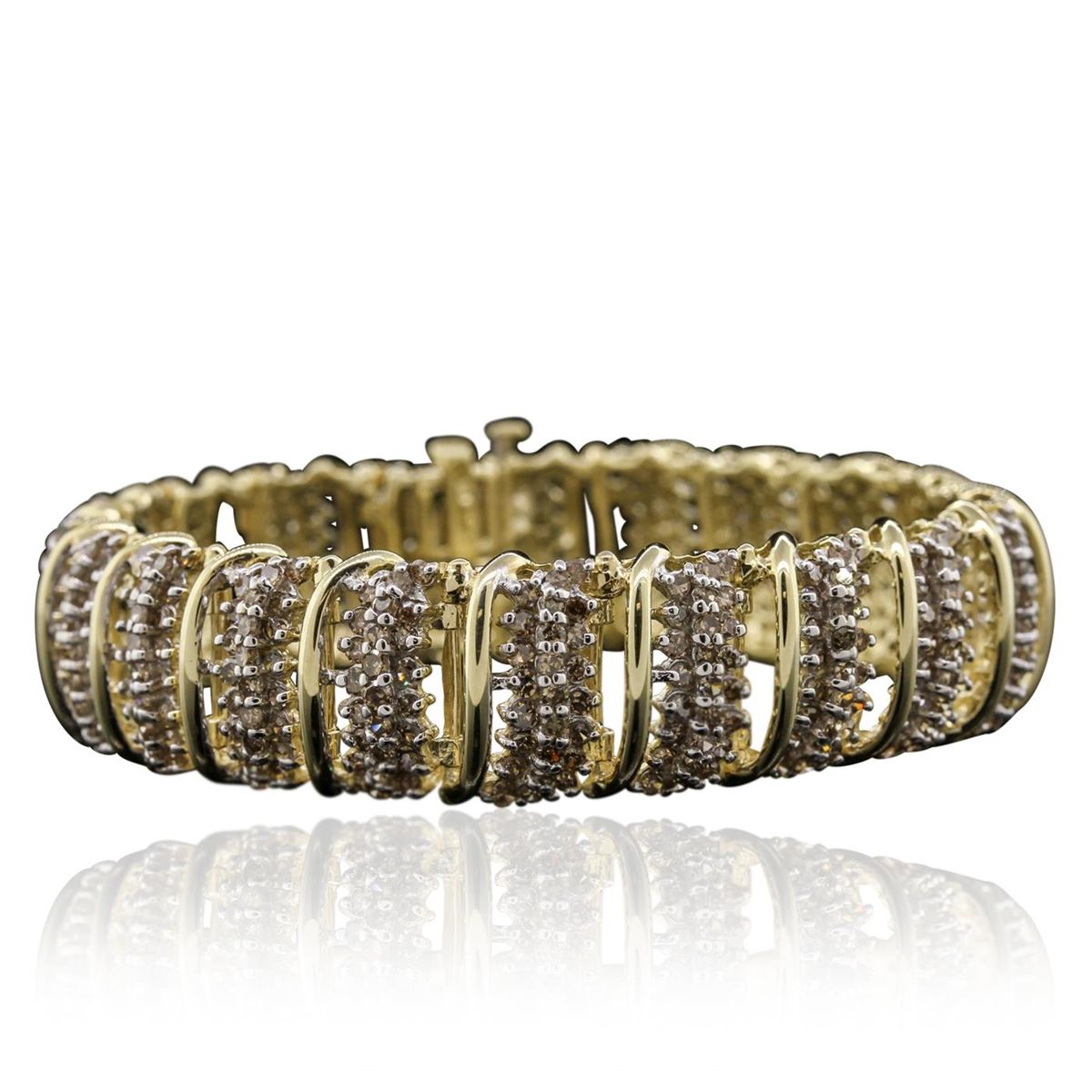 One electronically tested 10KT yellow gold ladies cast & assembled diamond bracelet. Condition is good. Seven inch length bracelet features a ribbon of diamond clusters alternated by yellow gold ribbons terminating in a concealed clasp with safety bar. Bright polish finish with rhodium accents. Identified with markings of "14K". Containing: Five Hundred prong set single cut diamonds, measuring 1.80 - 1.50 x 0.99mm (depth est.) approximate. Total Weight of 500 Stones = 8.31ct. Color grade is an average for the group. Graded in the setting. Clarity: VS-2 to SI-2. Total Weight of Diamonds 8.31ct. Total Weight of Bracelet 32.20 grams. AIG Appraised at $20,820.00.