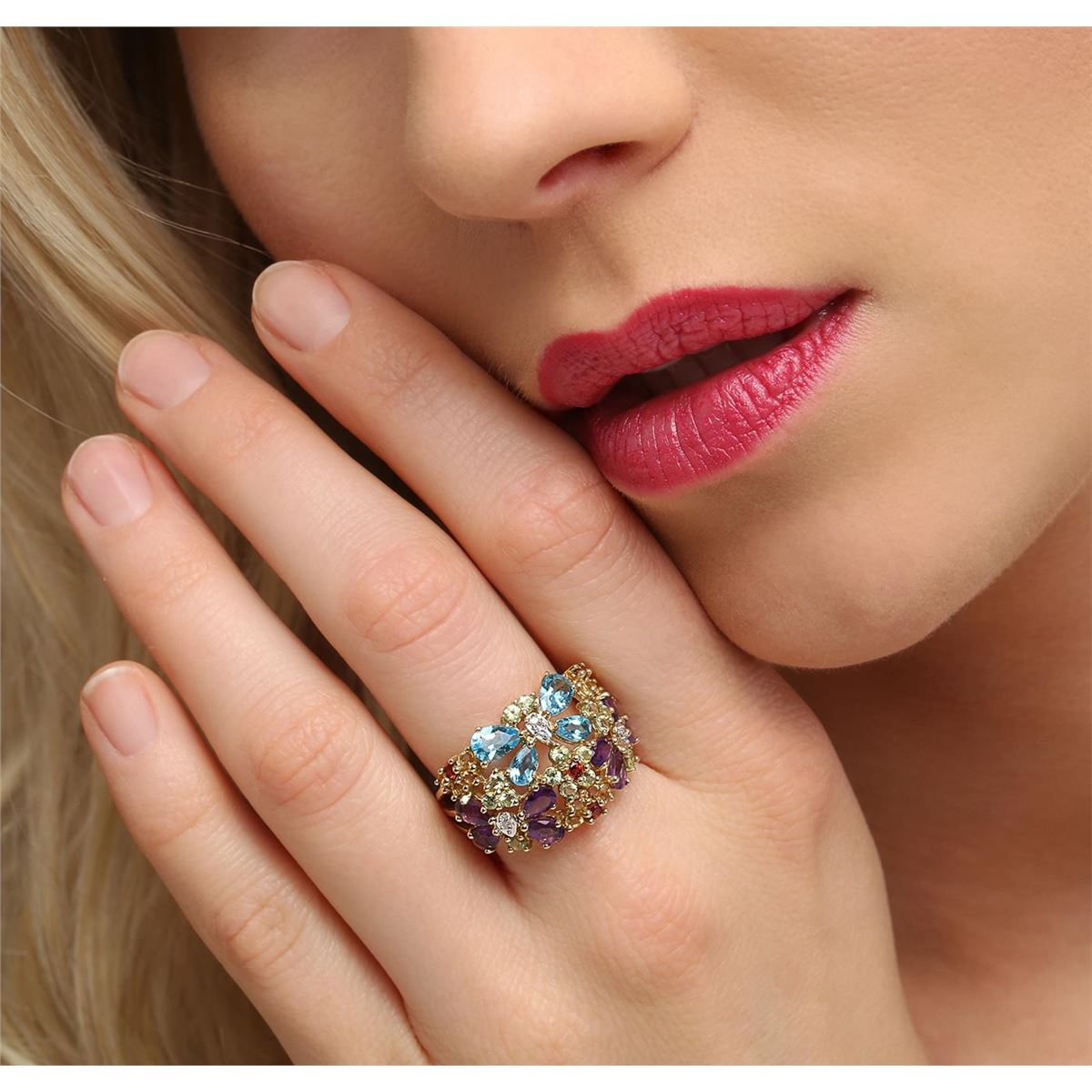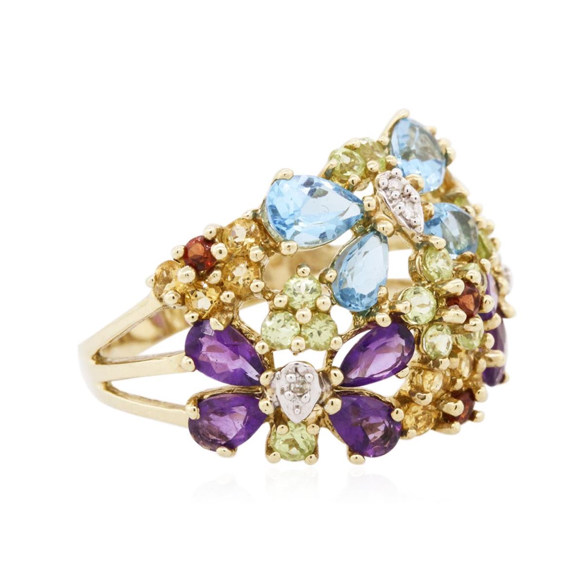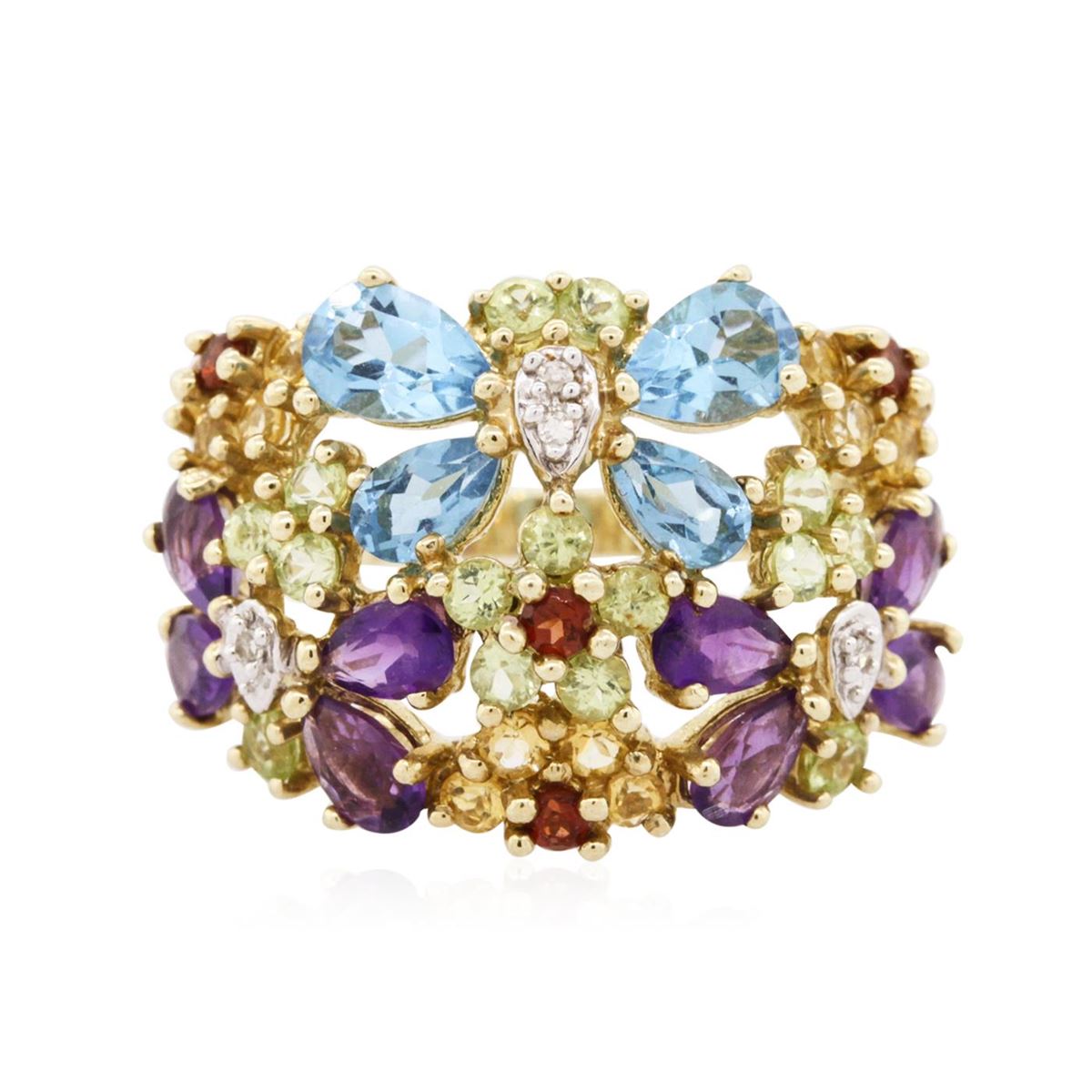 One multi-gemstone ring featuring: 10KT yellow gold weighing 5.70 grams containing amethyst with a total weight of 1.20cts, blue topaz with a total weight of 0.90cts, yellow topaz with a total weight of 0.36cts, peridot with a total weight of 0.50cts, garnet with a total weight of 0.20cts, and diamonds with a total weight of 0.02cts.