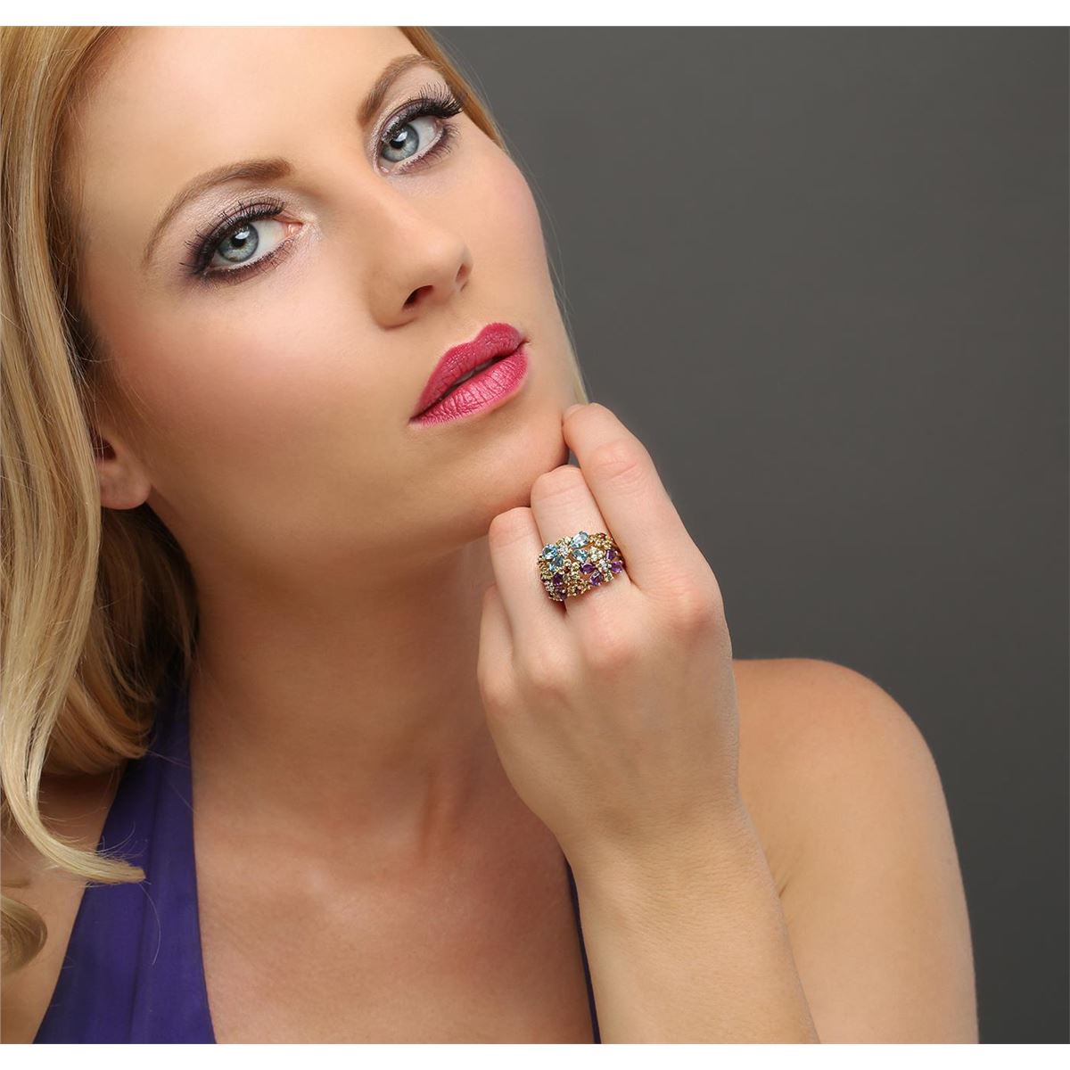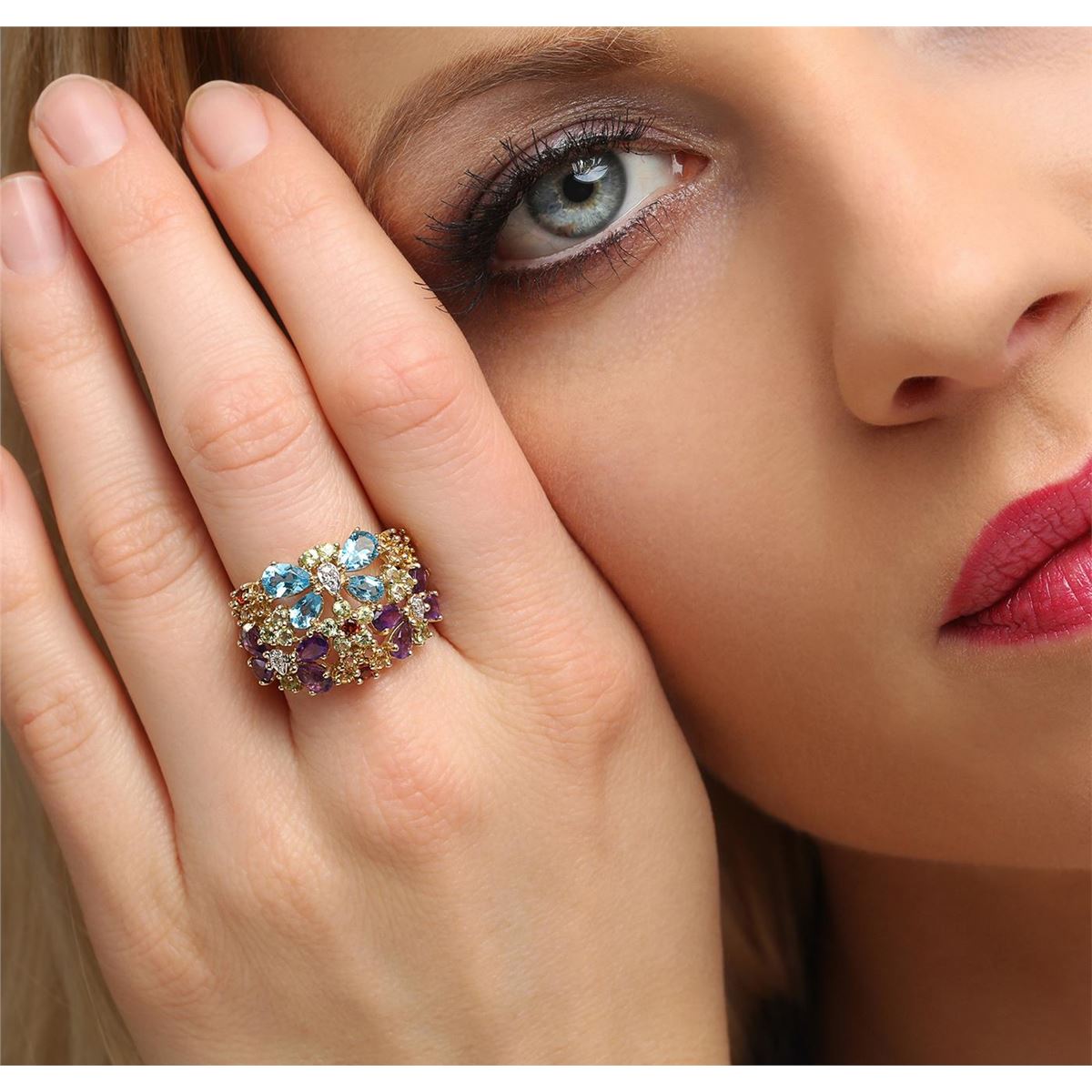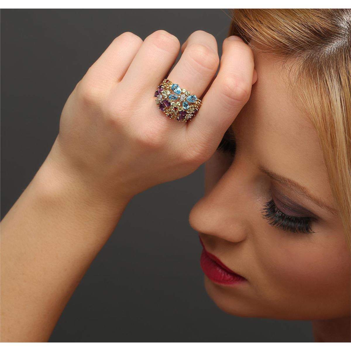 One multi-gemstone ring featuring: 10KT yellow gold weighing 5.70 grams containing amethyst with a total weight of 1.20cts, blue topaz with a total weight of 0.90cts, yellow topaz with a total weight of 0.36cts, peridot with a total weight of 0.50cts, garnet with a total weight of 0.20cts, and diamonds with a total weight of 0.02cts.