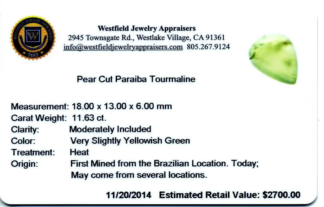 11.63ct. Pear Cabochon Cut Paraiba Tourmaline Westfield Appraised at $2,700.00.