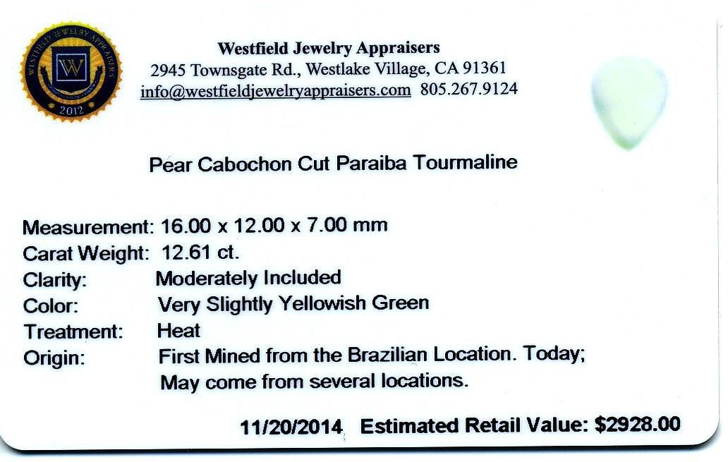12.61ct. Pear Cabochon Cut Paraiba Tourmaline Westfield Appraised at $2,928.00.