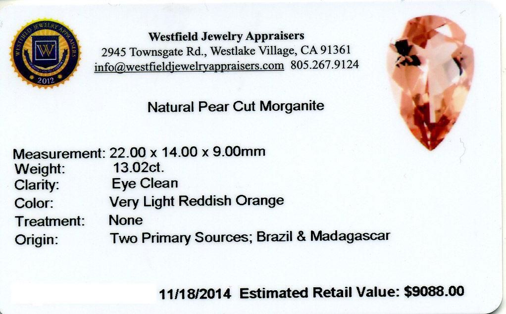 13.02ctw. Natural Pear Cut Morganite. Westfield Appraised at $9,088.00.
