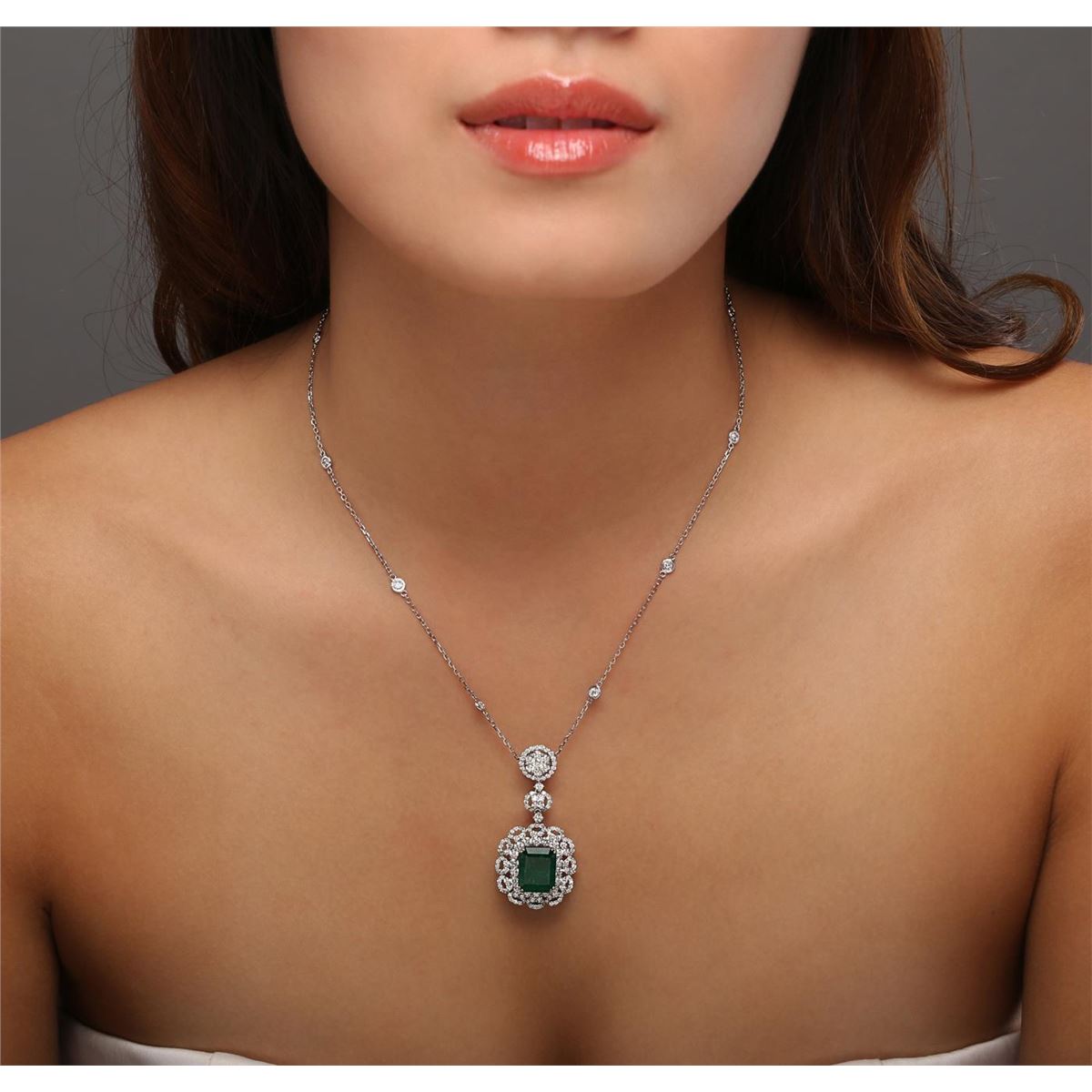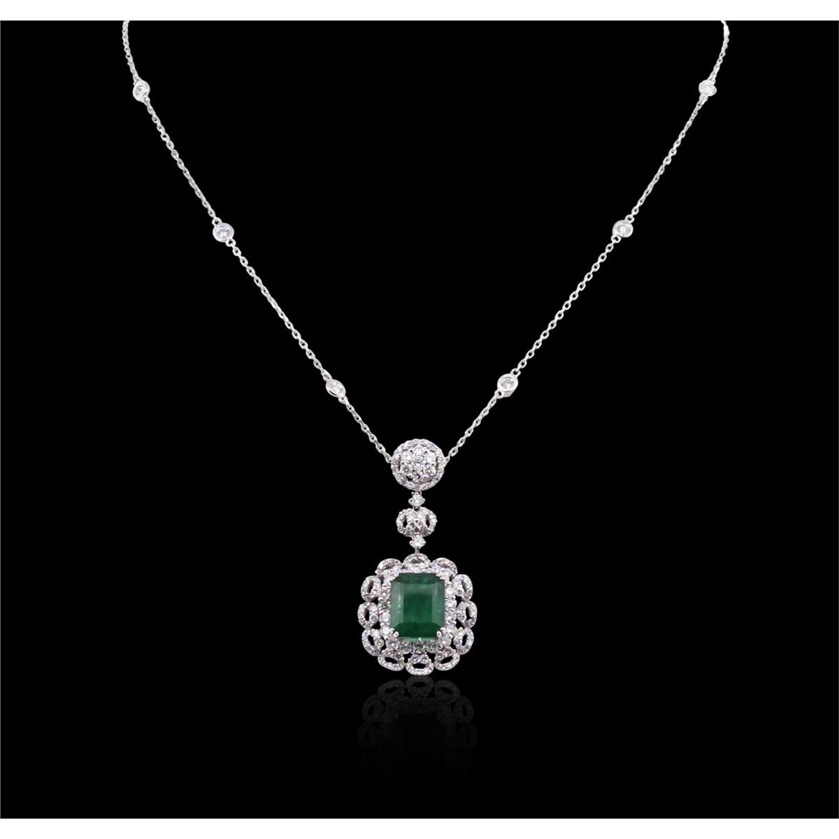 One pendant with chain featuring: 18KT white gold pendant weighing 5.67 grams containing one emerald center stone with a total weight of 5.24ct and round diamonds with a total weight of 3.27cts. The pendant is attached to a 14KT white gold chain weighing 2.83 grams.
