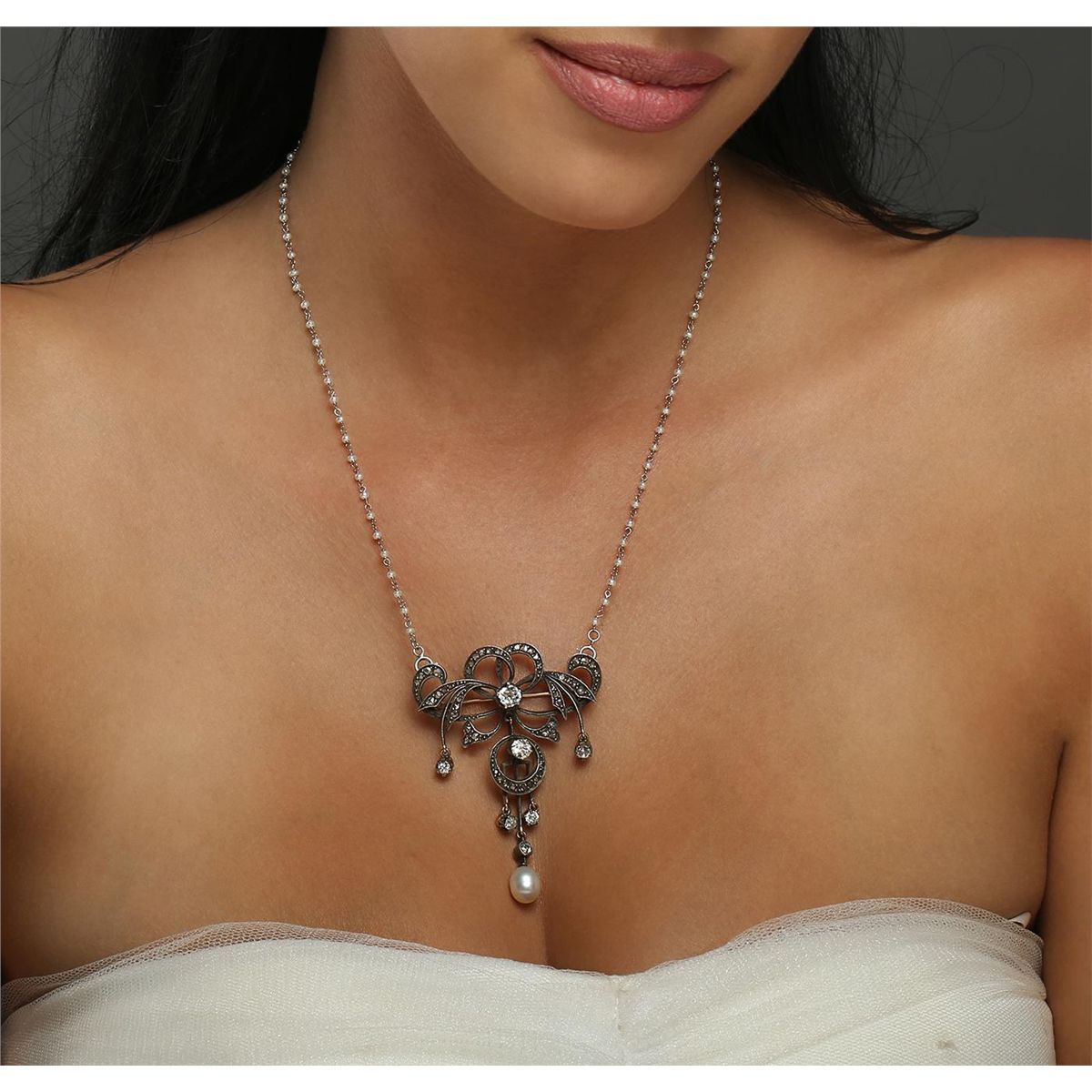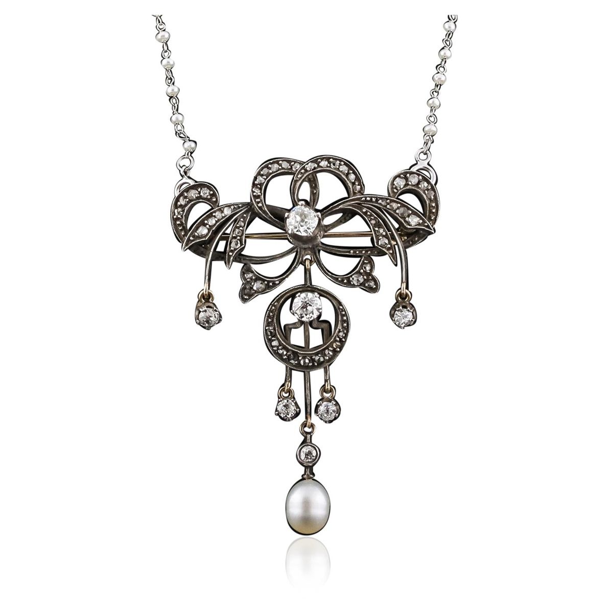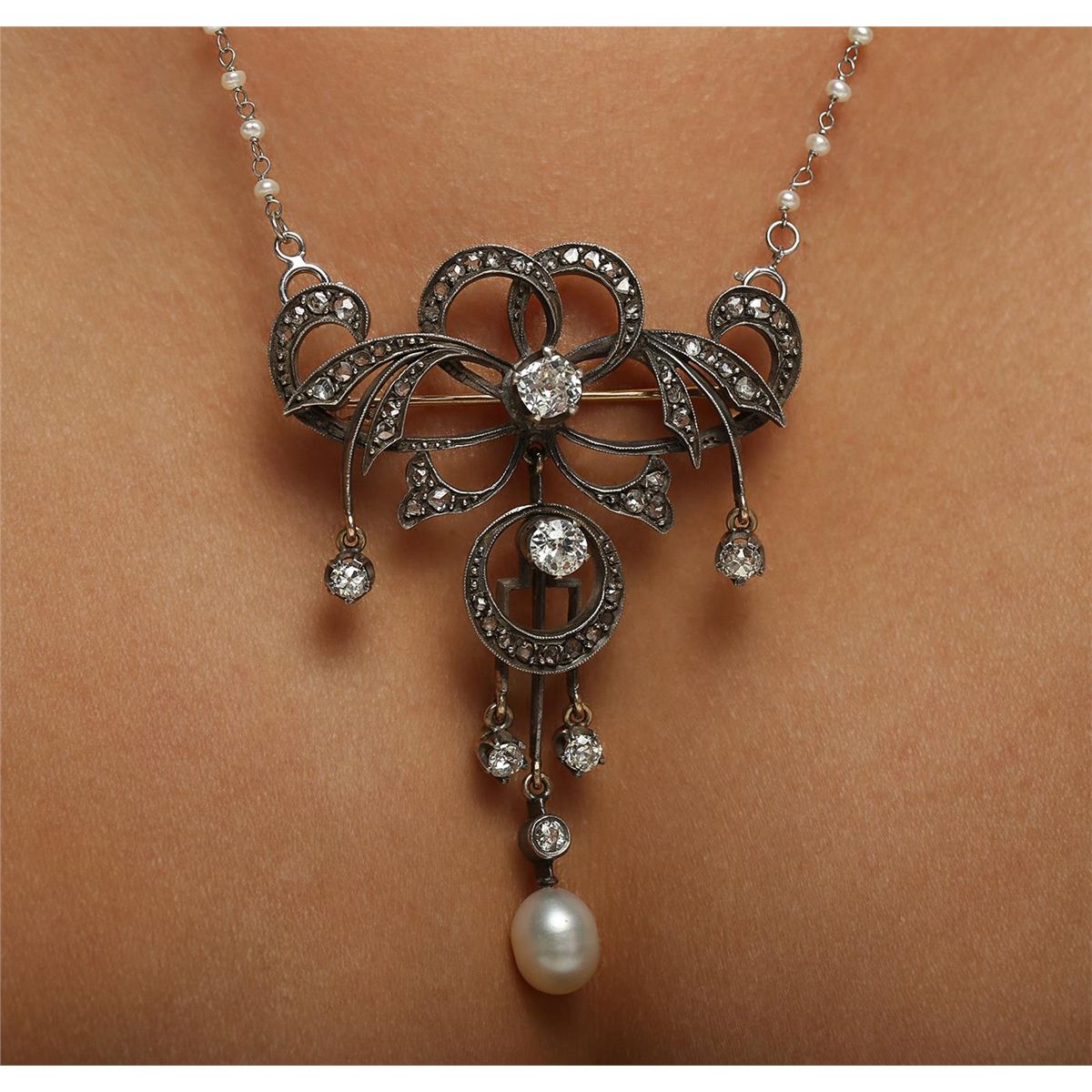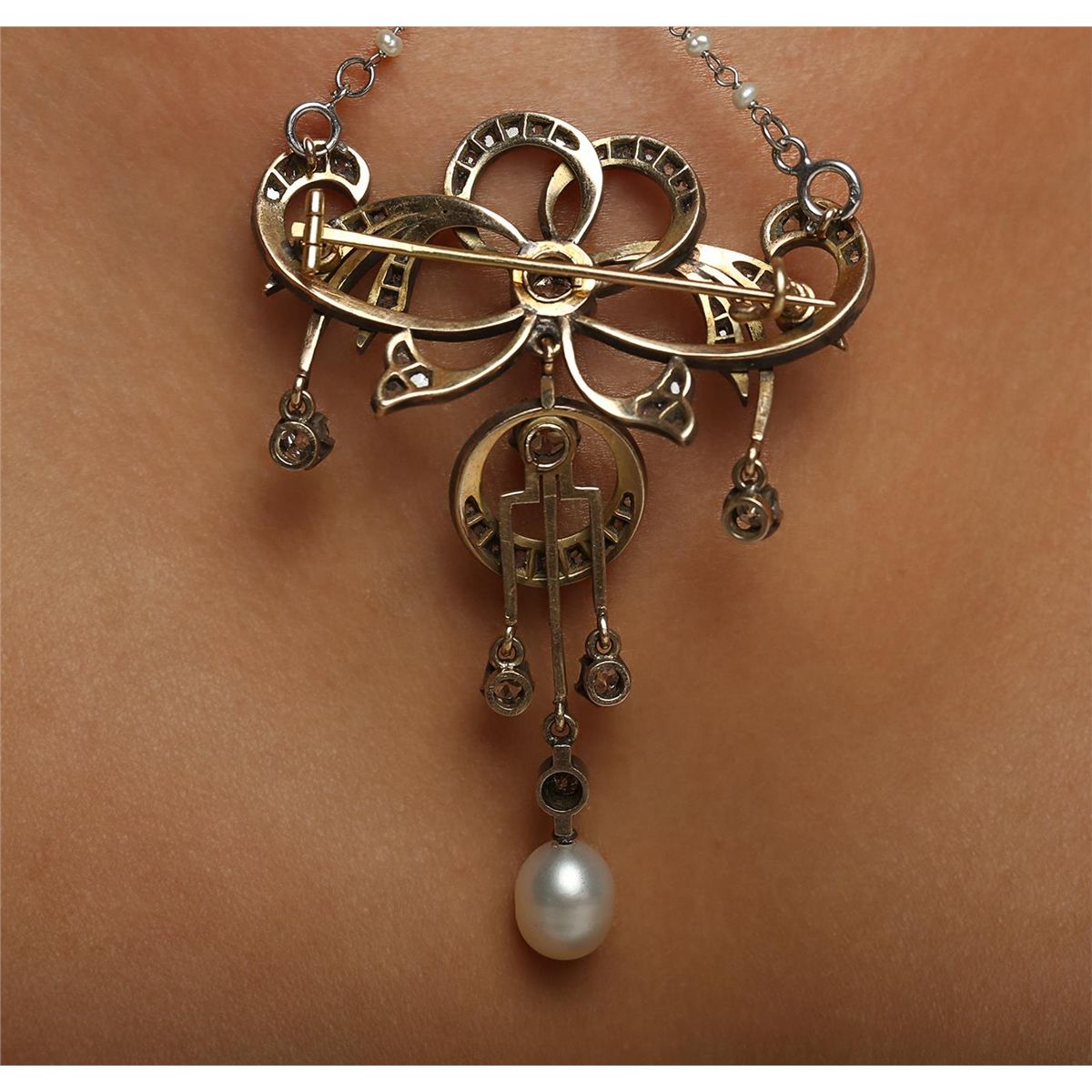 One electronically tested 14-18KT yellow and white gold ladies hand assembled vintage necklace with a antiqued finish. Pendant section has needle clasp closure, measures 2.50" x 1.80", necklace secure with spring clasp closure, measures 16.50" in length. Identified with markings of "14K". Condition is good. Containing: One Chinese freshwater pearl, 7.7mm in size to 9.0mm in size. The pearl is white in color with a good luster, off round, moderately blemished. One uniform single strand pearl chain 15.5" unknotted, containing 79 Chinese freshwater pearls, 2.3mm in size to 2.5mm in size. The pearls are white in color with a good luster, near round, moderately blemished. One prong set old mine cut diamond, measuring 5.19 - 5.09 x 3.19mm (depth est.) approximate weight of 0.51ct. Clarity: SI-2. Color: I. One prong set Old European cut diamond, measuring 5.00 - 5.00 x 3.10mm (depth est.) approximate weight of 0.47ct. Clarity: SI-2. Color: I. Five prong set Old European cut diamonds, measuring 3.00 - 3.00 x 1.86mm (depth est.) approximate total weight of 5 Stones = 0.51ct. Clarity: SI-2 to I-1. Color: I - J. Forty-Eight prong set rose cut diamonds, measuring 2.40 - 1.20 x 1.12mm (depth est.) approximate total weight of 48 Stones = 0.75ct. Clarity: I-1 to I-2. Color: J - K. All diamonds are graded in the mounting, unless otherwise stated. Total Weight of Diamonds 2.25ct. Total Weight of Necklace 18.30 grams. GGL Appraised at $13,560.00.