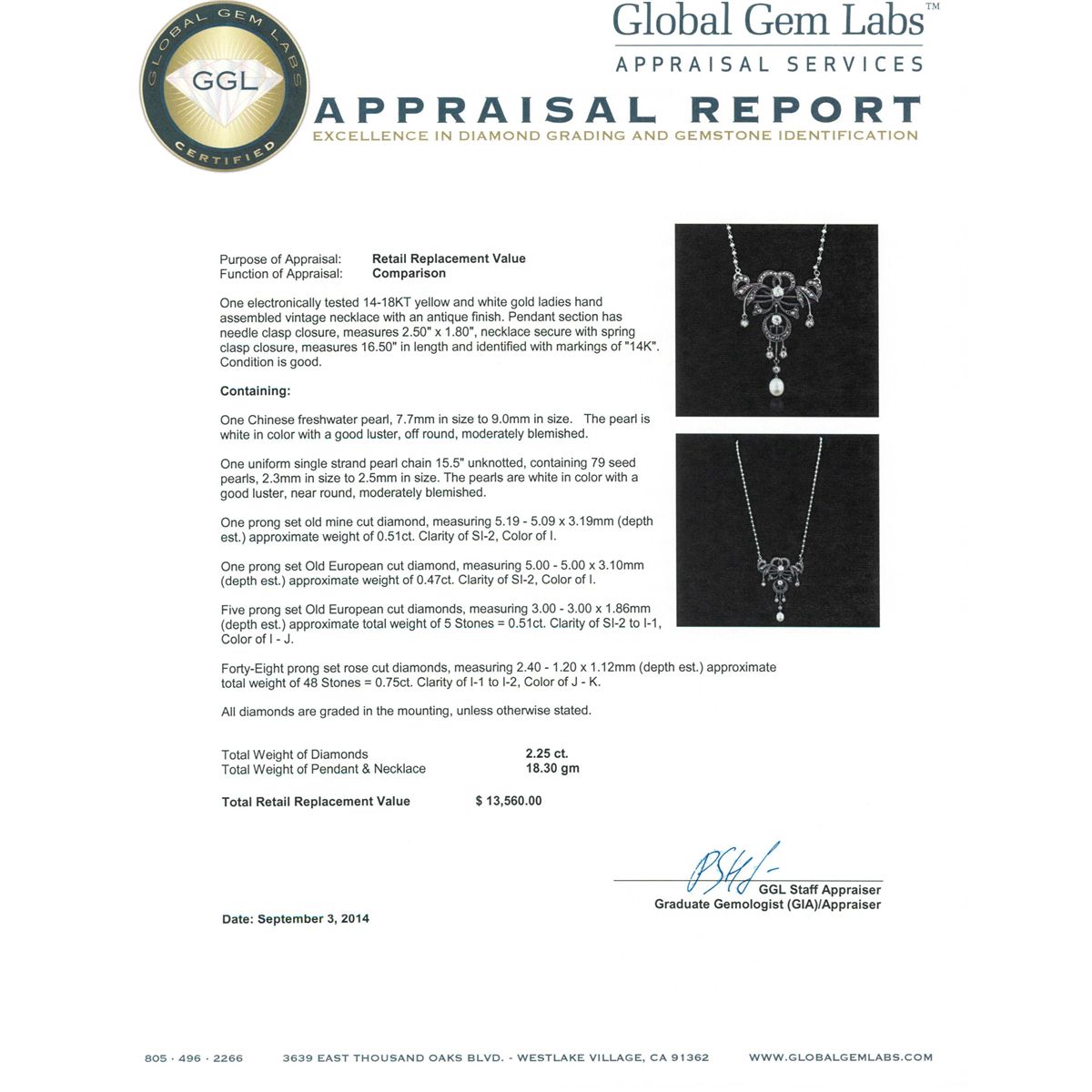 One electronically tested 14-18KT yellow and white gold ladies hand assembled vintage necklace with a antiqued finish. Pendant section has needle clasp closure, measures 2.50" x 1.80", necklace secure with spring clasp closure, measures 16.50" in length. Identified with markings of "14K". Condition is good. Containing: One Chinese freshwater pearl, 7.7mm in size to 9.0mm in size. The pearl is white in color with a good luster, off round, moderately blemished. One uniform single strand pearl chain 15.5" unknotted, containing 79 Chinese freshwater pearls, 2.3mm in size to 2.5mm in size. The pearls are white in color with a good luster, near round, moderately blemished. One prong set old mine cut diamond, measuring 5.19 - 5.09 x 3.19mm (depth est.) approximate weight of 0.51ct. Clarity: SI-2. Color: I. One prong set Old European cut diamond, measuring 5.00 - 5.00 x 3.10mm (depth est.) approximate weight of 0.47ct. Clarity: SI-2. Color: I. Five prong set Old European cut diamonds, measuring 3.00 - 3.00 x 1.86mm (depth est.) approximate total weight of 5 Stones = 0.51ct. Clarity: SI-2 to I-1. Color: I - J. Forty-Eight prong set rose cut diamonds, measuring 2.40 - 1.20 x 1.12mm (depth est.) approximate total weight of 48 Stones = 0.75ct. Clarity: I-1 to I-2. Color: J - K. All diamonds are graded in the mounting, unless otherwise stated. Total Weight of Diamonds 2.25ct. Total Weight of Necklace 18.30 grams. GGL Appraised at $13,560.00.