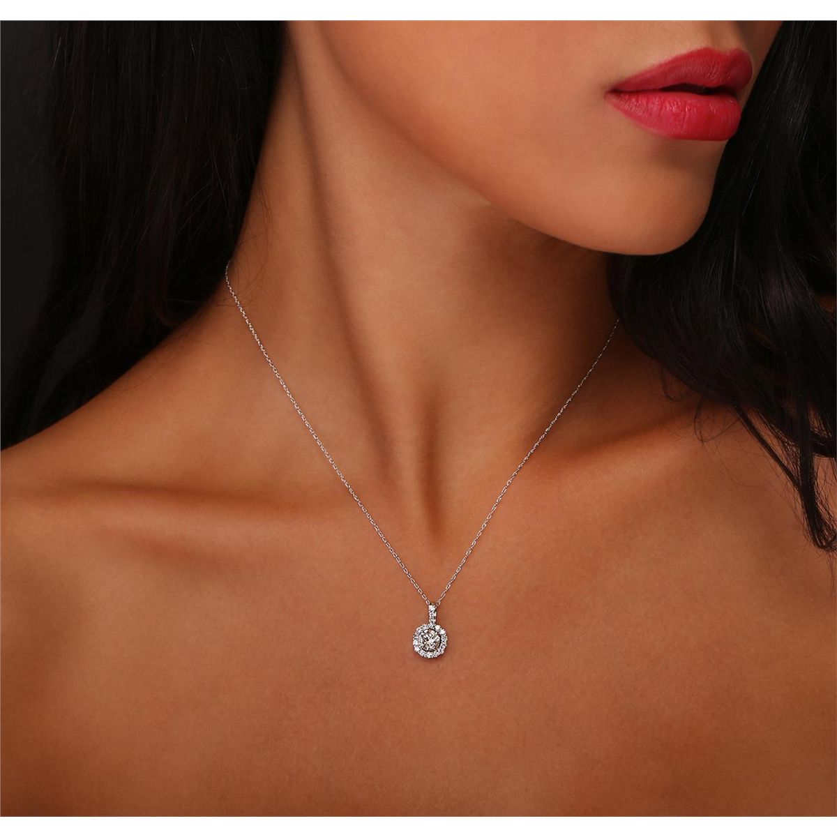 One electronically tested 14-18KT white gold Ladies combination cast & assembled pendant & chain 15.0" long, light cable link with a spring ring clasp with a bright polish finish. Condition is new. Chain stamped "14K", pendant stamped "750". Containing: One prong set round brilliant cut diamond, measuring 5.50 - 5.50 x 3.15mm (depth est.) approximate weight of 0.58ct. Clarity: SI-2. Color: N, Cut is Good. Seventeen prong set round brilliant cut diamonds, measuring 1.50 - 1.50 x 0.90mm (depth est.) approximate. Total Weight of 17 Stones = 0.21ct. Clarity: SI-2 to I-2. Color: I - J, Cut is Good. Total Weight of Diamonds 0.79ct. Total Weight of Pendant & Chain 1.80 grams. GGL Appraised at $3,675.00.