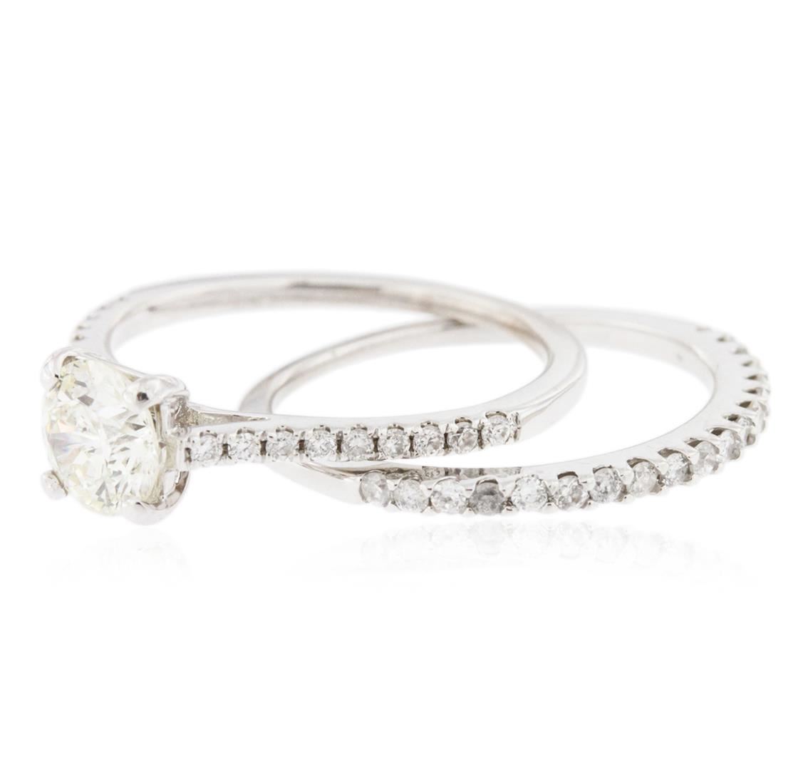 One electronically tested 18KT and 14KT white gold ladies cast diamond wedding set. The wedding set consists of a diamond engagement ring and a diamond wedding band. The 18KT white gold engagement features a diamond supported by diamond set shoulders, completed by a one millimeter wide band. The 14KT white gold diamond wedding band is completed by a one millimeter wide band. Bright polish finish. Identified with markings of "18K 14K". Condition is good. Containing: One prong set round brilliant cut diamond, measuring 5.60 - 5.55 x 3.60mm (depth est.) approximate weight of 0.78ct with a medium blue fluorescence. Graded in the setting. Clarity: I-1. Color: L. Depth 64.6%. Table 59.3%. Thirty-Seven prong set round brilliant cut diamonds, measuring 1.30 - 1.20 x 0.75mm (depth est.) approximate total weight of 37 Stones = 0.30ct. Graded in the setting. Clarity: SI-2 to I-2. Color: G - I. Total Weight of Diamonds 1.08ct. Total Weight of Wedding Set 3.05 grams. AIG Appraised at $5,100.00.
