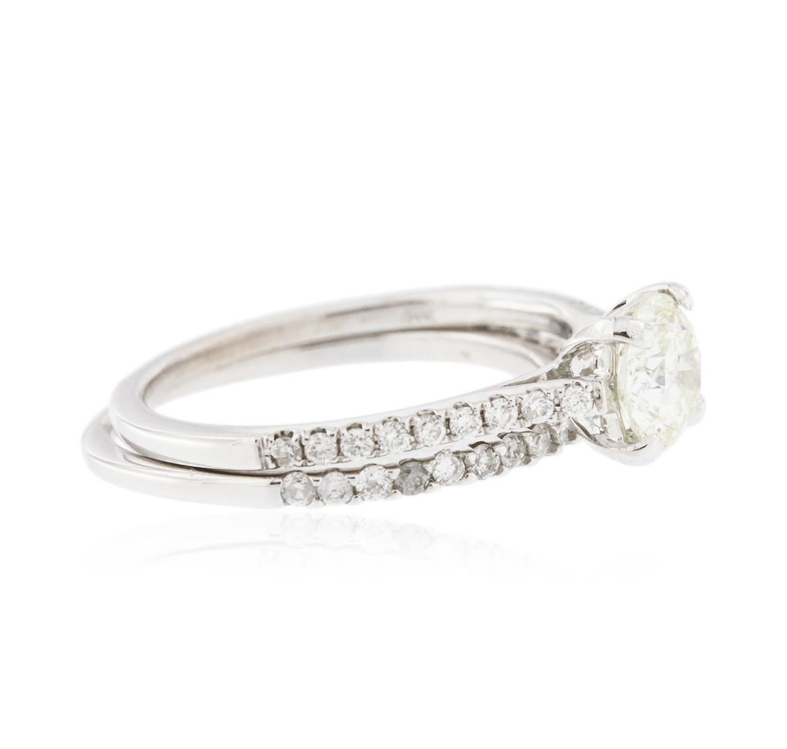 One electronically tested 18KT and 14KT white gold ladies cast diamond wedding set. The wedding set consists of a diamond engagement ring and a diamond wedding band. The 18KT white gold engagement features a diamond supported by diamond set shoulders, completed by a one millimeter wide band. The 14KT white gold diamond wedding band is completed by a one millimeter wide band. Bright polish finish. Identified with markings of "18K 14K". Condition is good. Containing: One prong set round brilliant cut diamond, measuring 5.60 - 5.55 x 3.60mm (depth est.) approximate weight of 0.78ct with a medium blue fluorescence. Graded in the setting. Clarity: I-1. Color: L. Depth 64.6%. Table 59.3%. Thirty-Seven prong set round brilliant cut diamonds, measuring 1.30 - 1.20 x 0.75mm (depth est.) approximate total weight of 37 Stones = 0.30ct. Graded in the setting. Clarity: SI-2 to I-2. Color: G - I. Total Weight of Diamonds 1.08ct. Total Weight of Wedding Set 3.05 grams. AIG Appraised at $5,100.00.