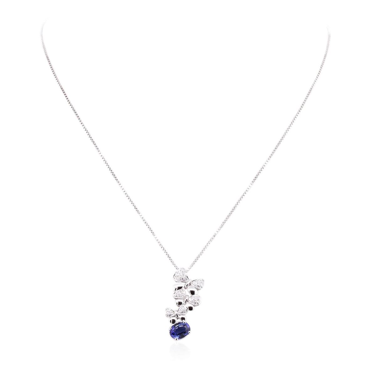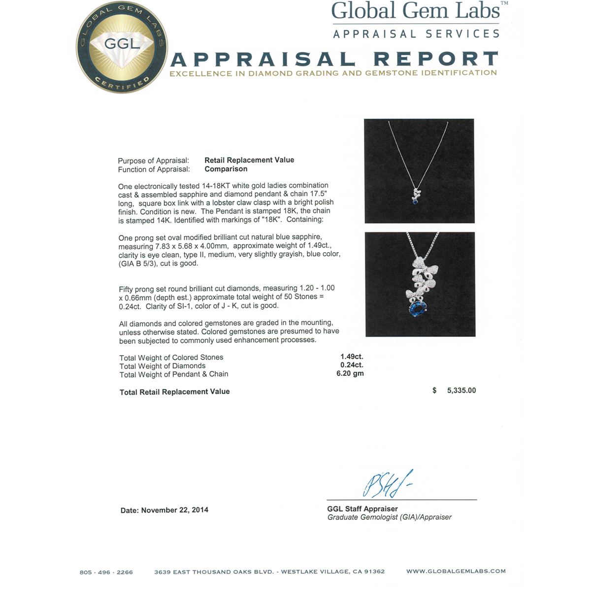 One electronically tested 14-18KT gold ladies combination cast & assembled sapphire and diamond pendant & chain 17.5" long, square box link with a lobster claw clasp with a bright polish finish. The Pendant is stamped 18K, the chain is stamped 14K. Identified with markings of "18K". Condition is new. Containing: One prong set oval modified brilliant cut natural blue sapphire, measuring 7.83 x 5.68 x 4.00mm, approximate weight of 1.49ct., clarity is eye clean, type II, medium, very slightly grayish, blue color, (GIA B 5/3), cut is good. Fifty prong set round brilliant cut diamonds, measuring 1.20 - 1.00 x 0.66mm (depth est.) approximate total weight of 50 Stones = 0.24ct. Clarity: SI-1. Color: J - K, Cut is Good. All diamonds and colored gemstones are graded in the mounting, unless otherwise stated. Colored gemstones are presumed to have been subjected to commonly used enhancement processes. Total Weight of Colored Stones 1.49ct. Total Weight of Diamonds 0.24ct. Total Weight of Pendant & Chain 6.20 grams. GGL Appraised at $5,335.00.