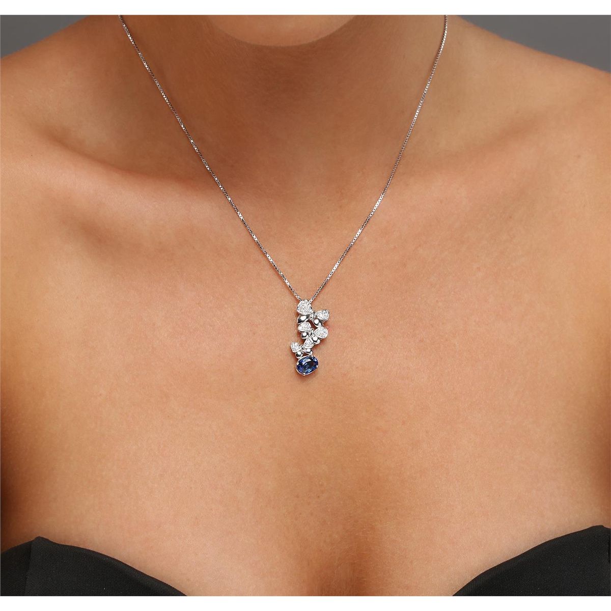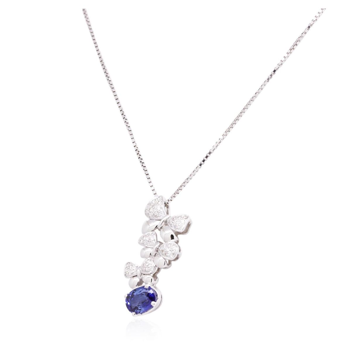 One electronically tested 14-18KT gold ladies combination cast & assembled sapphire and diamond pendant & chain 17.5" long, square box link with a lobster claw clasp with a bright polish finish. The Pendant is stamped 18K, the chain is stamped 14K. Identified with markings of "18K". Condition is new. Containing: One prong set oval modified brilliant cut natural blue sapphire, measuring 7.83 x 5.68 x 4.00mm, approximate weight of 1.49ct., clarity is eye clean, type II, medium, very slightly grayish, blue color, (GIA B 5/3), cut is good. Fifty prong set round brilliant cut diamonds, measuring 1.20 - 1.00 x 0.66mm (depth est.) approximate total weight of 50 Stones = 0.24ct. Clarity: SI-1. Color: J - K, Cut is Good. All diamonds and colored gemstones are graded in the mounting, unless otherwise stated. Colored gemstones are presumed to have been subjected to commonly used enhancement processes. Total Weight of Colored Stones 1.49ct. Total Weight of Diamonds 0.24ct. Total Weight of Pendant & Chain 6.20 grams. GGL Appraised at $5,335.00.