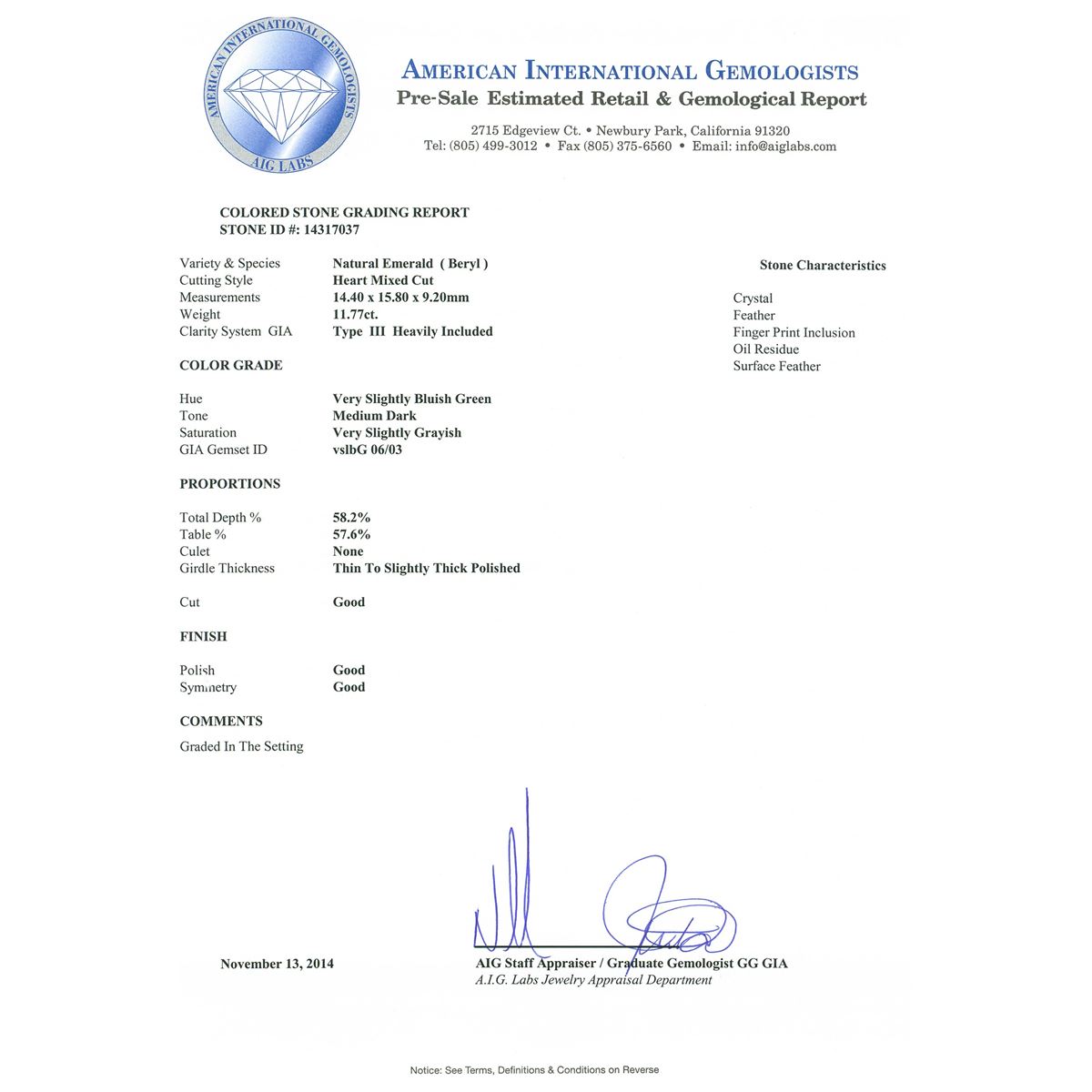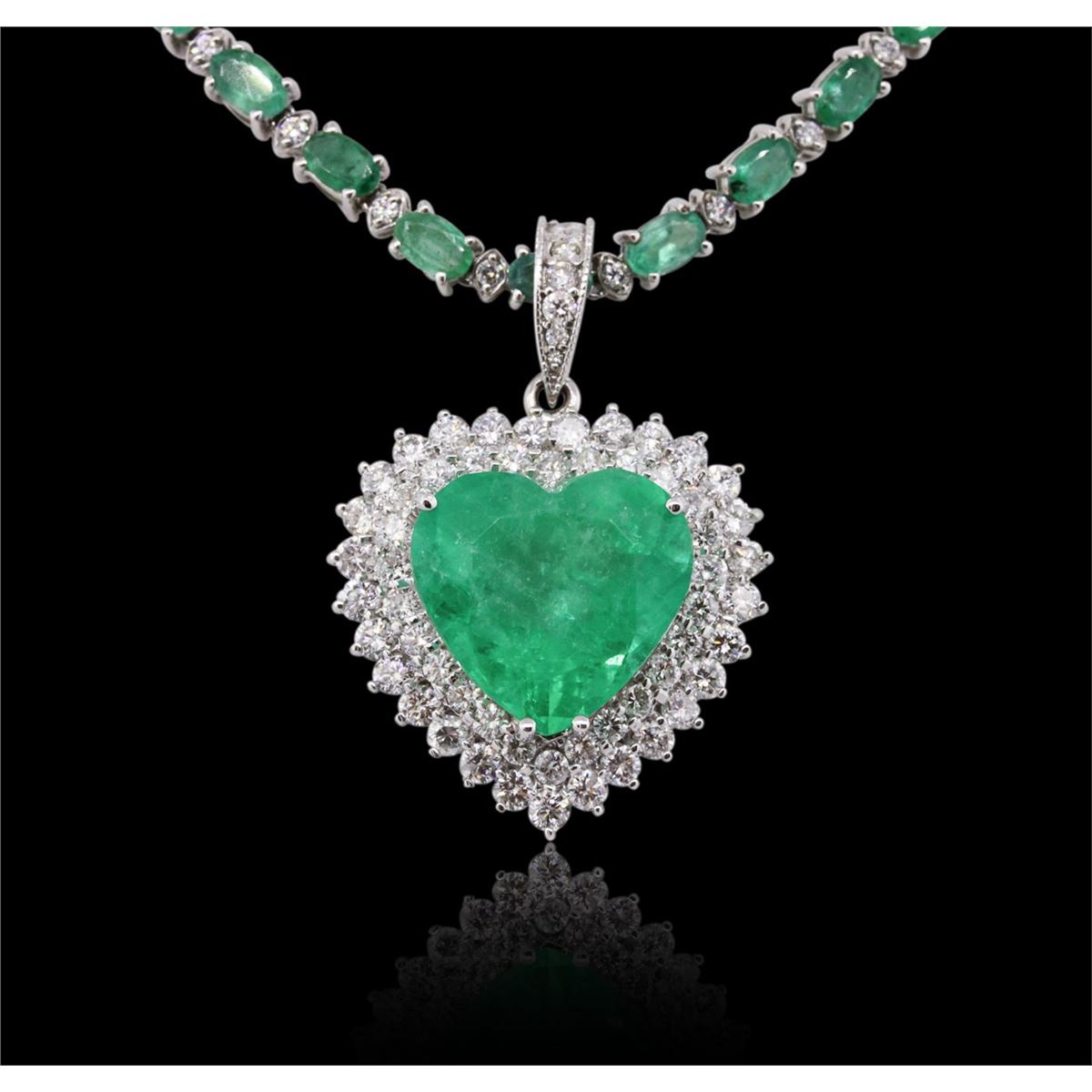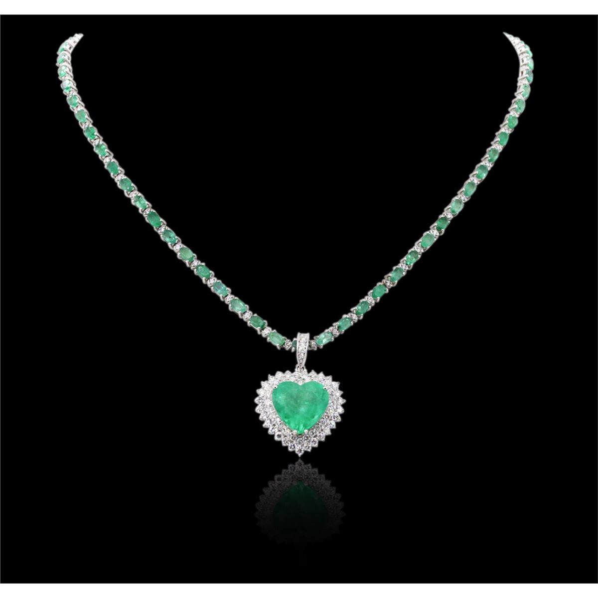 One electronically tested 14KT and 18KT white gold ladies cast & assembled emerald and diamond necklace. Eighteen and one-half inch length necklace features an 18KT white gold pendant consisting of a heart shaped emerald set within two tiered diamond bezel, completed by a diamond set bail. The necklace is supported by a 14KT white gold flexible emerald and diamond ribbon, terminating in a concealed clasp with safety. Bright polish finish. Identified with markings of "K14 18K". Condition is new, good workmanship. Containing: One prong set heart mixed cut natural emerald, measuring 14.40 x 15.80 x 9.20mm, 6% bulge factor, approximate weight of 11.77ct., clarity is heavily included, type III, medium dark, very slightly grayish, very slightly bluish green color, (GIA vslbG 6/3), cut is good. Transmitting light with a minimum of distortion, transparent. Naturally occurring internal & external characteristics are present. Indications of oil residue. Colored Stone Grading Report attached. Graded in the setting. Sixty-four prong set oval mixed cut natural emeralds, measuring 5.00 x 3.00 x 1.95mm, 6% bulge factor, approximate total weight of 11.52ct., clarity is heavily included, type III, medium dark, very slightly grayish, very slightly bluish green color, (GIA vslbG 6/3), cut is good. Transmitting light somewhat diffusely, transparent to translucent. Naturally occurring internal & external characteristics are present. Measurements & the color grade are an average for the group. Indications of oil residue. Graded in the setting. Fifty-Five prong set round brilliant cut diamonds, measuring 2.30 - 2.00 x 1.29mm (depth est.) approximate total weight of 55 Stones = 2.10ct. Graded in the setting. Clarity: SI-1 to I-1. Color: G - I Seventy-One prong set round brilliant cut diamonds, measuring 1.90 - 1.80 x 1.11mm (depth est.) approximate total weight of 71 Stones = 1.74ct. Graded in the setting. Clarity: SI-2 to I-1. Color: G - I. Total Weight of Colored Stones 23.29ct. Total Weight of Diamonds 3.84ct. Total Weight of Necklace 28.23 grams. AIG Appraised at $47,415.00.