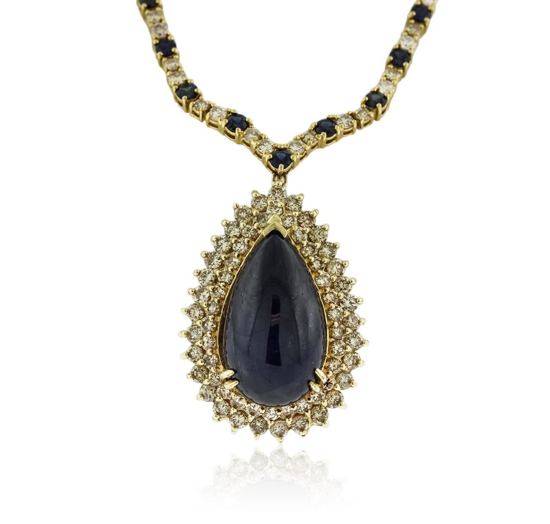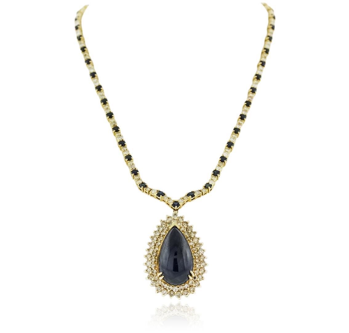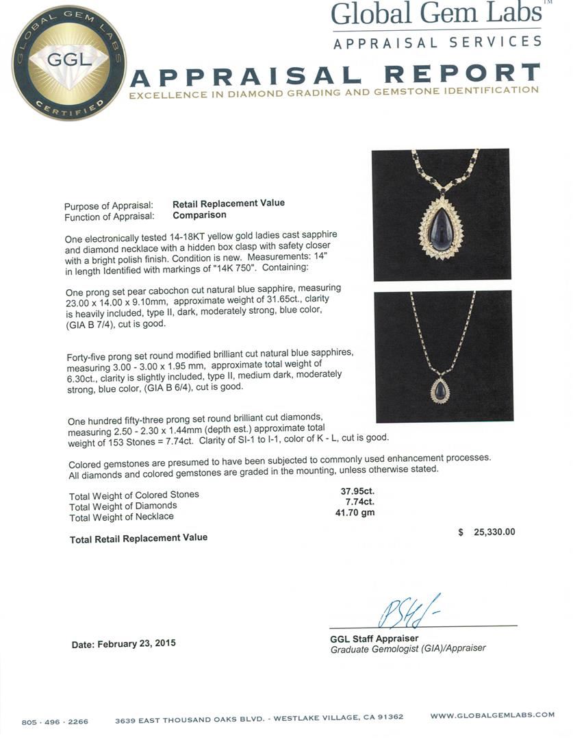 One electronically tested 14-18KT yellow gold ladies cast sapphire and diamond necklace with a hidden box clasp with safety closer with a bright polish finish. Measurements: 14" in length Identified with markings of "14K 750". Condition is new. Containing: One prong set pear cabochon cut natural blue sapphire, measuring 23.00 x 14.00 x 9.10mm, approximate weight of 31.65ct., clarity is heavily included, type II, dark, moderately strong, blue color, (GIA B 7/4), cut is good. Forty-five prong set round modified brilliant cut natural blue sapphires, measuring 3.00 - 3.00 x 1.95 mm, approximate total weight of 6.30ct., clarity is slightly included, type II, medium dark, moderately strong, blue color, (GIA B 6/4), cut is good. One Hundred Fifty-Three prong set round brilliant cut diamonds, measuring 2.50 - 2.30 x 1.44mm (depth est.) approximate total weight of 153 Stones = 7.74ct. Clarity: SI-1 to I-1. Color: K - L, Cut is Good. Colored gemstones are presumed to have been subjected to commonly used enhancement processes. All diamonds and colored gemstones are graded in the mounting, unless otherwise stated. Total Weight of Colored Stones 37.95ct. Total Weight of Diamonds 7.74ct. Total Weight of Necklace 41.70 grams. GGL Appraised at $25,330.00.