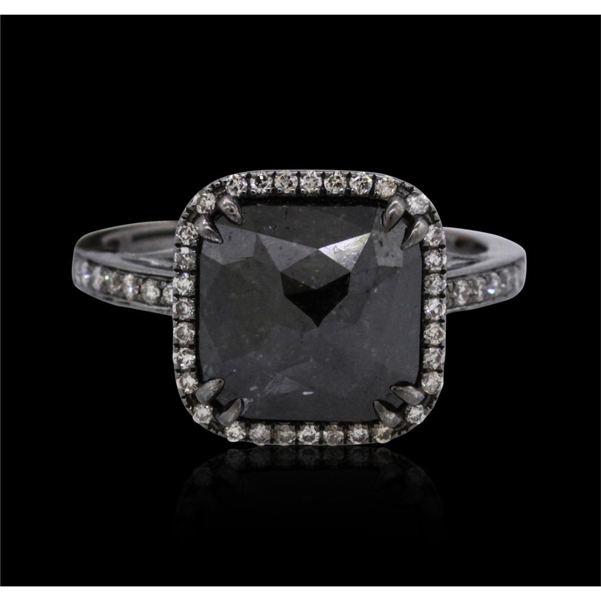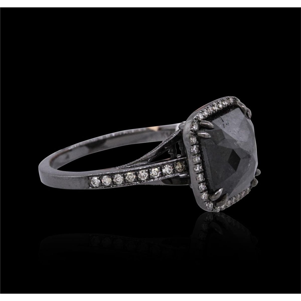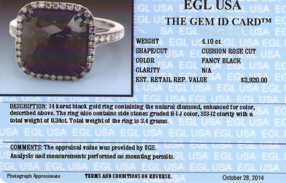One 14KT black gold ring containing one natural cushion rose cut fancy black diamond, enhanced for color, with a total weight of 4.10ct. The ring also contains side stones graded H-I-J color, SI3-I2 clarity with a total weight of 0.34ct. Total weight of the ring is 3.40 grams. EGL USA Appraised.