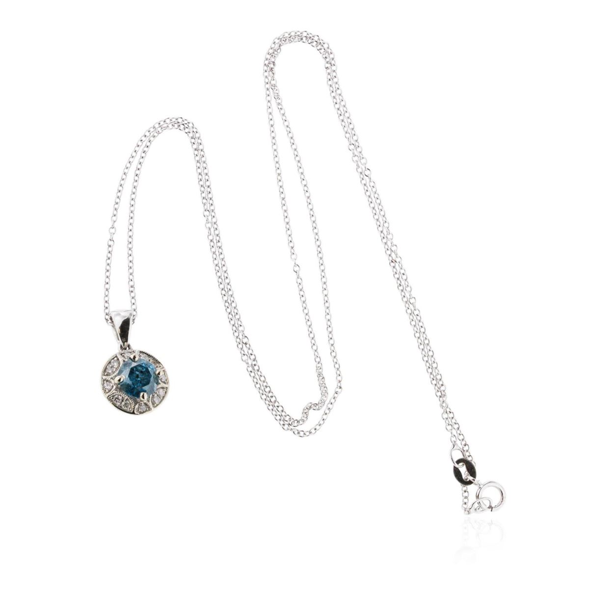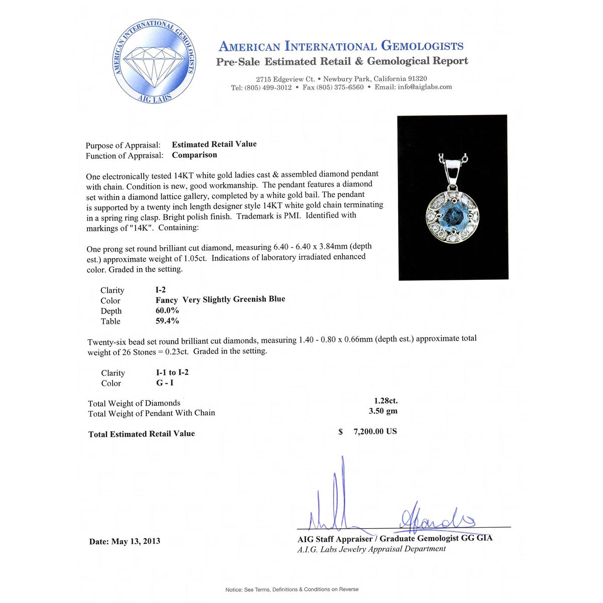 One electronically tested 14KT white gold ladies cast & assembled diamond pendant with chain. Condition is new, good workmanship. The pendant features a diamond set within a diamond lattice gallery, completed by a white gold bail. The pendant is supported by a twenty inch length designer style 14KT white gold chain terminating in a spring ring clasp. Bright polish finish. Trademark is PMI. Identified with markings of "14K". Containing: One prong set round brilliant cut diamond, measuring 6.40 - 6.40 x 3.84mm (depth est.) approximate weight of 1.05ct. Indications of laboratory irradiated enhanced color. Graded in the setting. Clarity I-2. Color Fancy Very Slightly Greenish Blue. Depth 60.0%. Table 59.4%. Twenty-six bead set round brilliant cut diamonds, measuring 1.40 - 0.80 x 0.66mm (depth est.) approximate total weight of 26 Stones = 0.23ct. Graded in the setting. Clarity I-1 to I-2. Color G - I. Total Weight of Diamonds 1.28ct. Total Weight of Pendant With Chain 3.50 gm. AIG Appraised at $7,200.00.