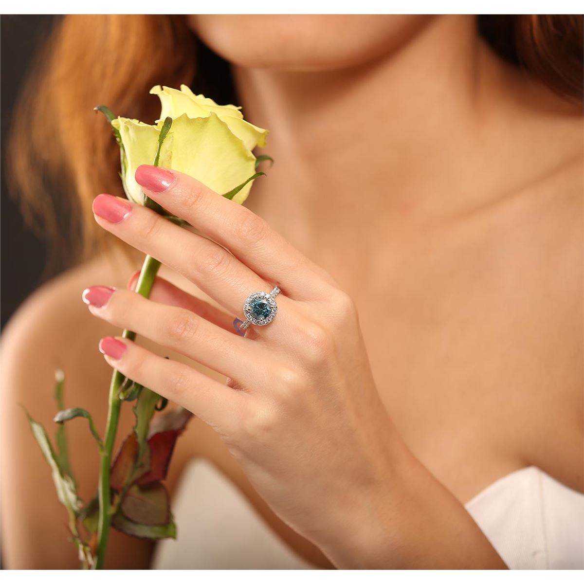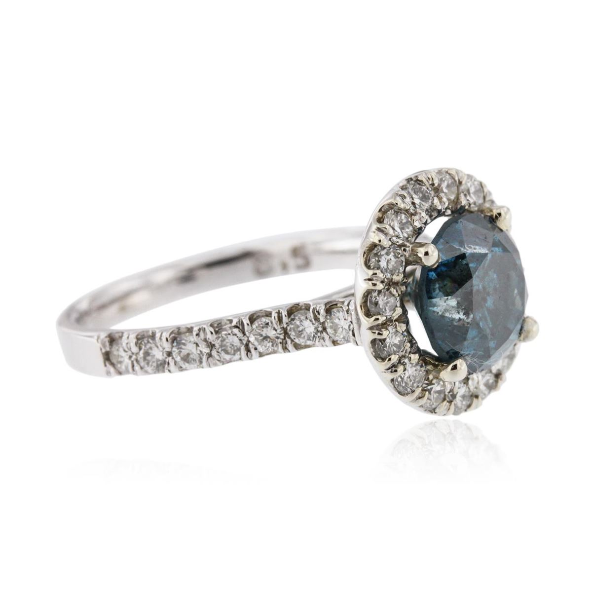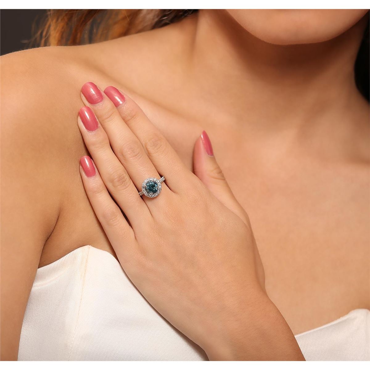14KT Gold 2.34ct I-2/Very Greenish Blue & White Diamond Ring A4859. One electronically tested 14KT white gold ladies cast & assembled diamond ring with a bright polish finish. Condition is good. The featured diamond is set within a diamond bezel supported by diamond set shoulders, completed by a two millimeter wide band. Identified with markings of "14K". Containing: One prong set round brilliant cut diamond, measuring 7.80 - 7.70 x 5.80mm (depth est.), 10.00% GTCF approximate weight og 2.34ct with a faint blue fluorescence. Indications of laboratory irradiated enhanced color. Graded in the setting. Clarity I-2. Color Fancy Very Slightly Greenish Blue. Depth 74.8%. Table 58.1%. Thirty prong set round brilliant cut diamonds, measuring 2.00 - 1.80 x 1.14mm (depth est.) approximate total weight of 30 Stones = 0.80ct. Graded in the setting. Clarity SI-1 to I-1. Color G - I. Total Weight of Diamonds 3.14ct. Total Weight of Ring 4.01 gm. AIG Appraised at $20,950.00.