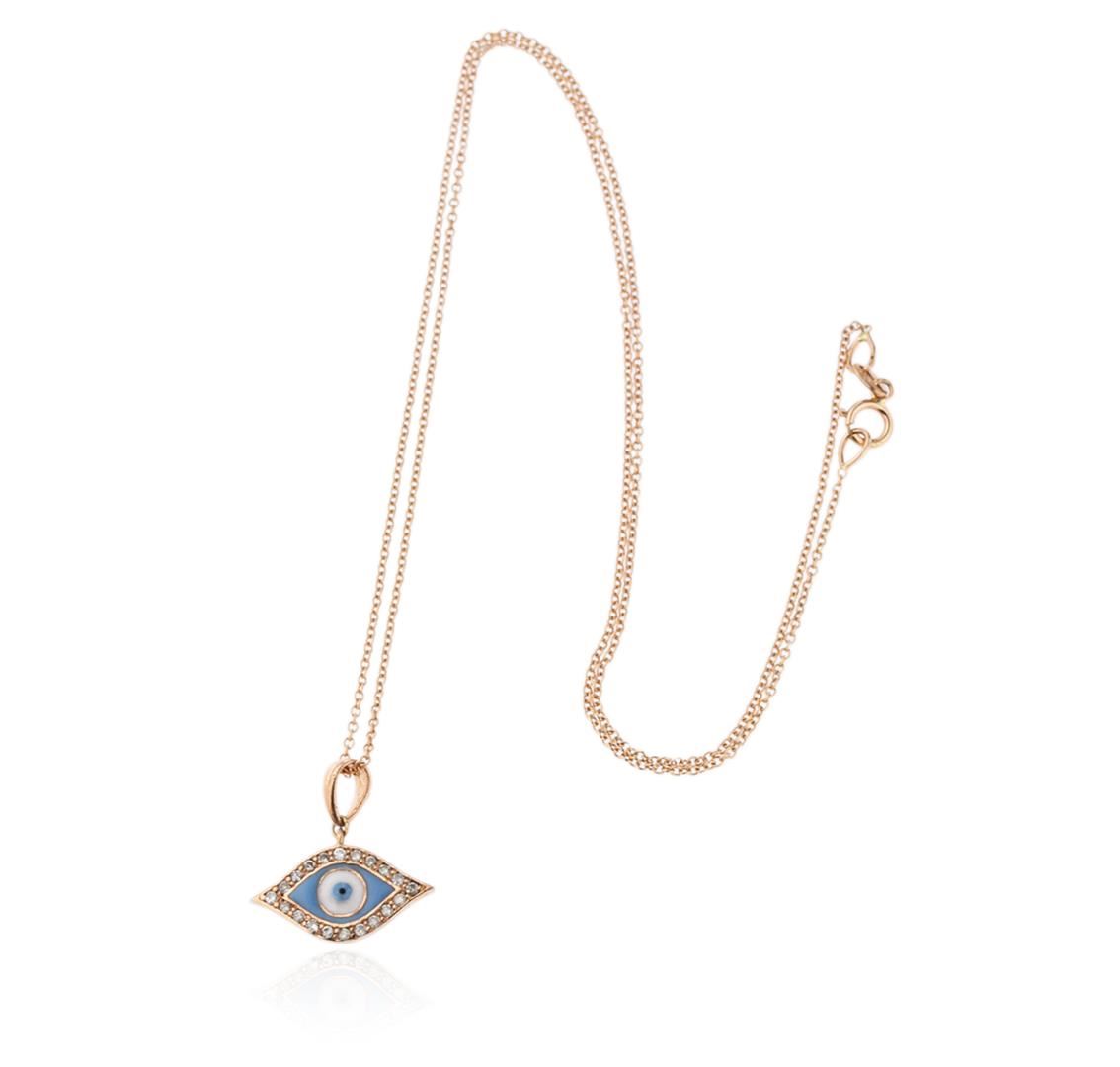 One evil eye pendant with chain featuring: 14KT rose gold weighing x grams containing pave set round diamonds with a total weight of 0.12ct.