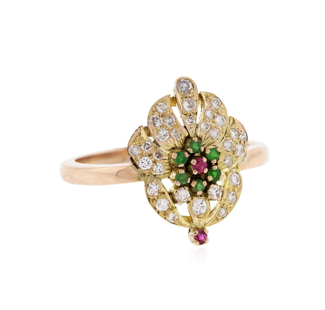 One ring featuring: 14KT rose gold weighing 4.30 grams containing emeralds with a total weight of 0.12ct, rubies with a total weight of 0.03ct, and diamonds with a total weight of 0.35ct.