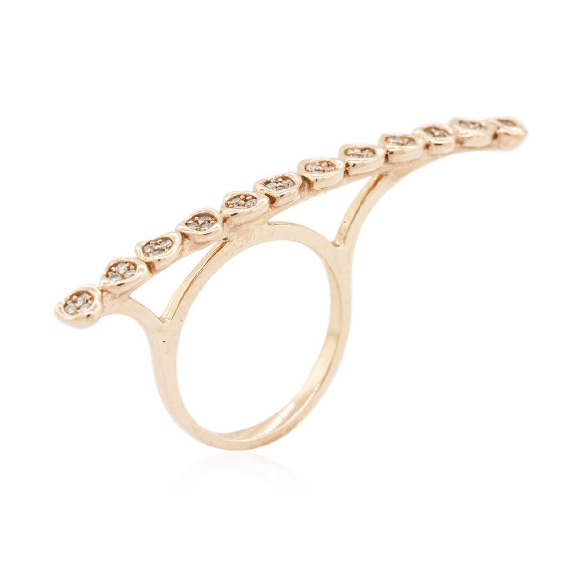 One electronically tested 14KT rose gold ladies cast diamond ring with a bright polish finish. Identified with markings of "585". Condition is new. Containing: Thirty-Six bead set round brilliant cut diamonds, measuring 1.00 - 1.00 x 0.60mm (depth est.) approximate total weight of 36 Stones = 0.13ct. Clarity: I-1 to I-2. Color: I - J. All diamonds are graded in the mounting, unless otherwise stated. Total Weight of Diamonds 0.13ct. Total Weight of Ring 5.00 grams. GGL Appraised at $2,125.00.