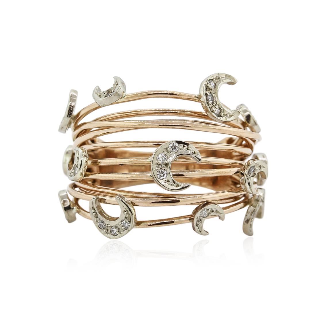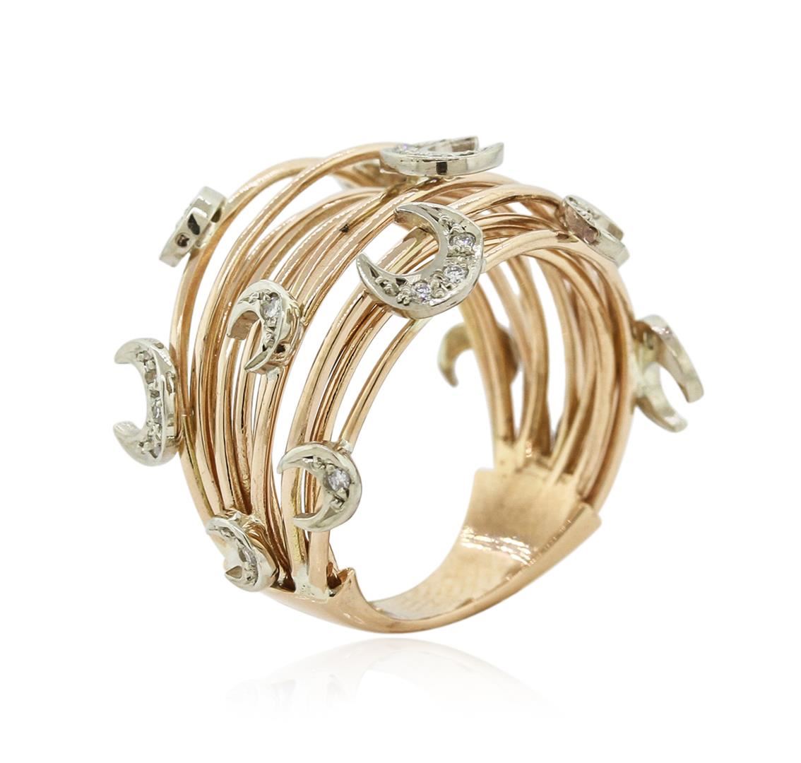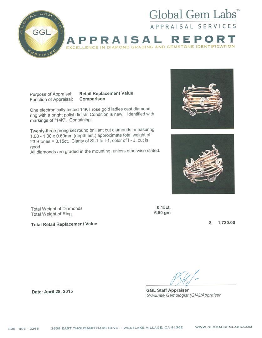 One electronically tested 14KT rose gold ladies cast diamond ring with a bright polish finish. Identified with markings of "14K". Condition is new. Containing: Twenty-Three prong set round brilliant cut diamonds, measuring 1.00 - 1.00 x 0.60mm (depth est.) approximate total weight of 23 Stones = 0.15ct. Clarity: SI-1 to I-1. Color: I - J, Cut is Good. All diamonds are graded in the mounting, unless otherwise stated. Total Weight of Diamonds 0.15ct. Total Weight of Ring 6.50 grams. GGL Appraised at $1,720.00.