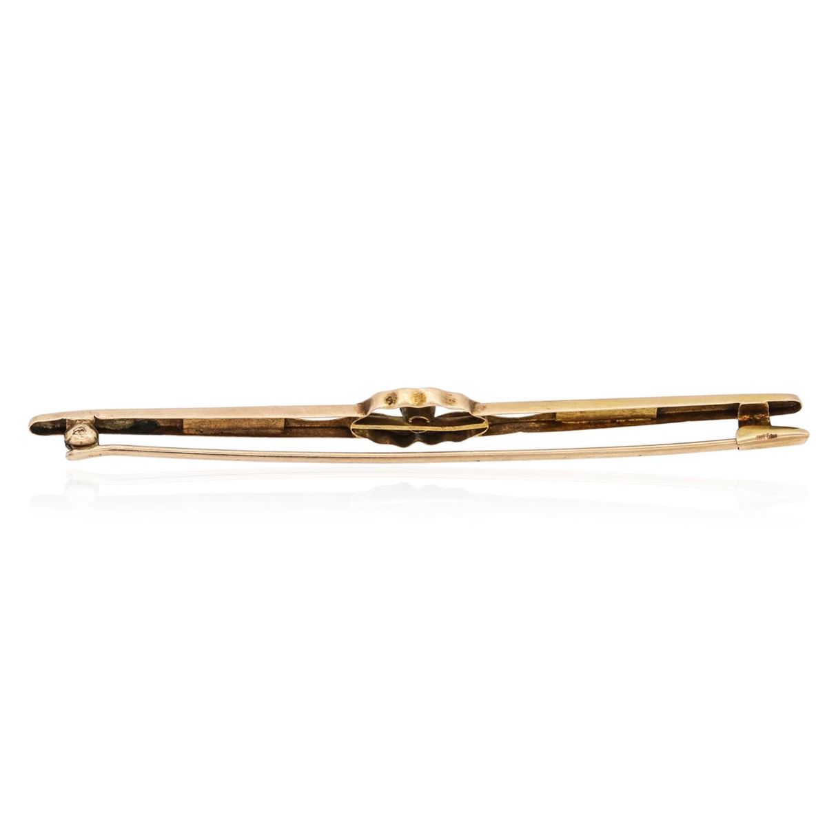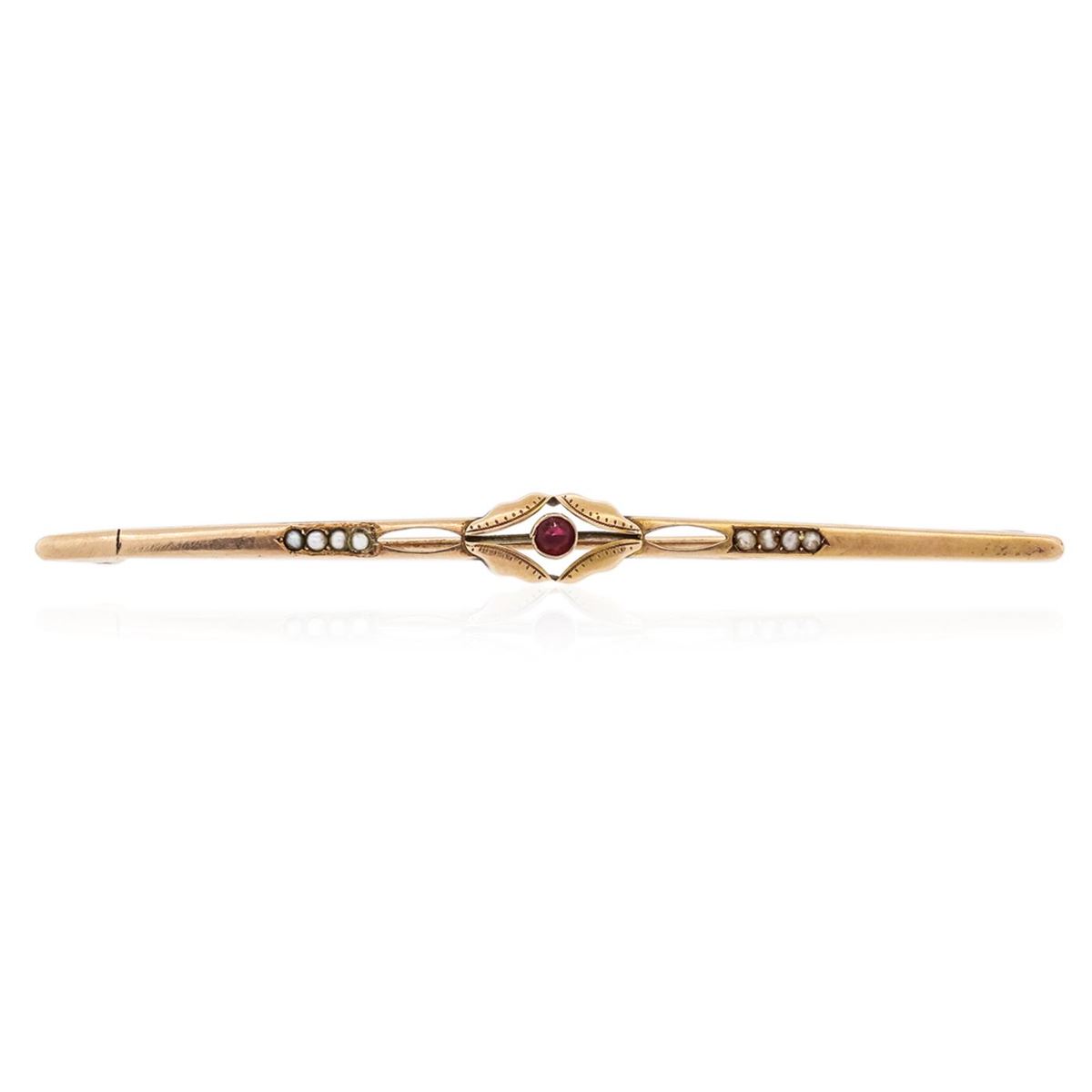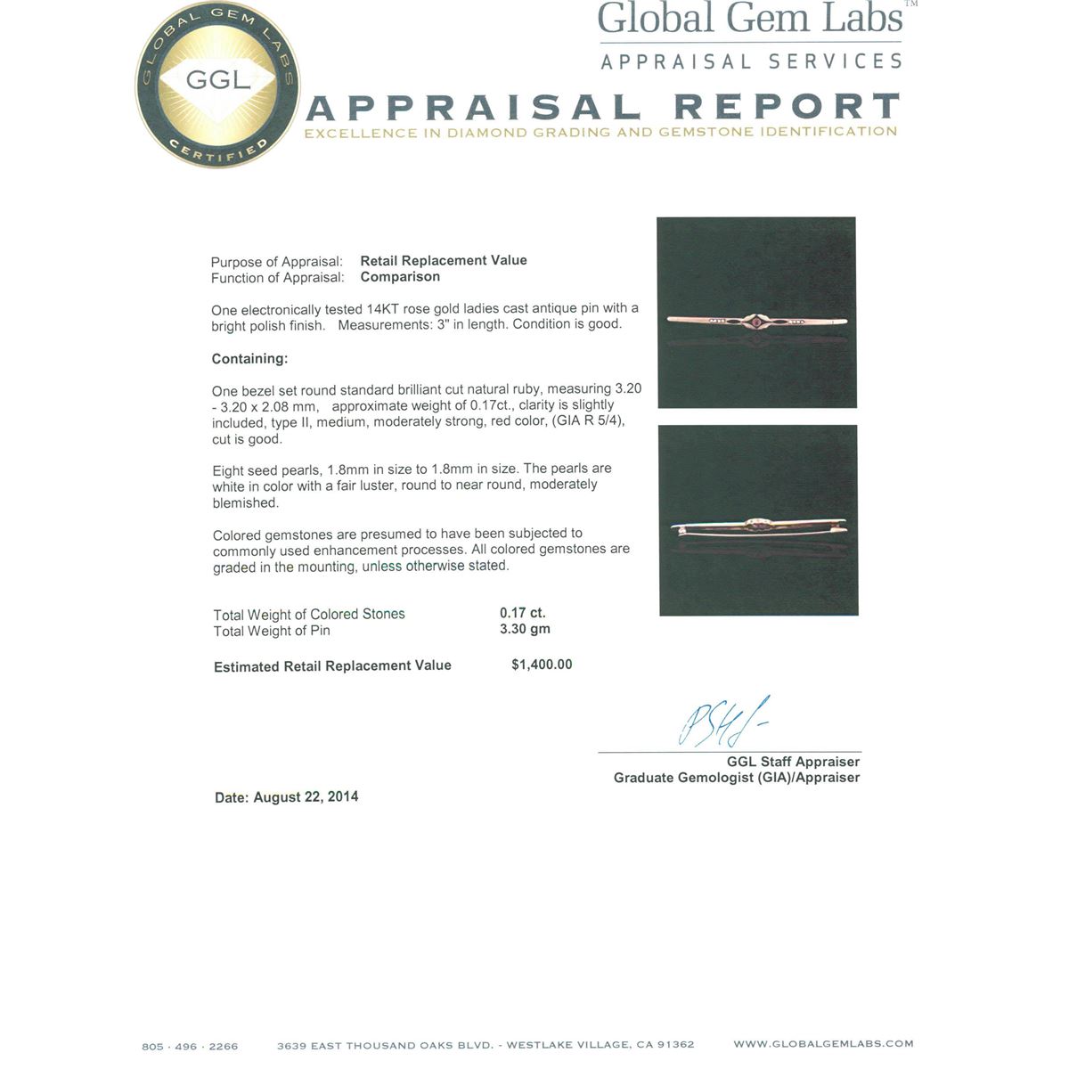 One electronically tested 14KT rose gold ladies cast antique pin with a bright polish finish. Measurements: 3" in length. Condition is good. Containing: One bezel set round standard brilliant cut natural ruby, measuring 3.20 - 3.20 x 2.08 mm, approximate weight of 0.17ct., clarity is slightly included, type II, medium, moderately strong, red color, (GIA R 5/4), cut is good. Eight seed pearls, 1.8mm in size to 1.8mm in size. The pearls are white in color with a fair luster, round to near round, moderately blemished. Colored gemstones are presumed to have been subjected to commonly used enhancement processes. All colored gemstones are graded in the mounting, unless otherwise stated. Total Weight of Colored Stones 0.17ct. Total Weight of Pin 3.30 grams. GGL Appraised at $1,400.00.