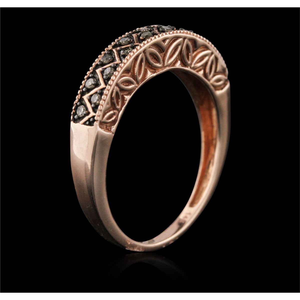 One electronically tested 14KT rose gold ladies cast diamond ring. The ring features a diamond set curvature supported by a floral motif under gallery, completed by a two millimeter wide band. Bright and anodized finish with milgrain detailing. Trademark is SJD. Identified with markings of "14K". Condition is good. Containing: Seventeen prong set single cut diamonds, measuring 1.40 - 1.30 x 0.81mm (depth est.) approximate total weight of 17 Stones = 0.20ct. Color grade is an average for the group. Graded in the setting. Clarity: SI-2 to I-1. Total Weight of Diamonds 0.20ct. Total Weight of Ring 3.99 grams. AIG Appraised.